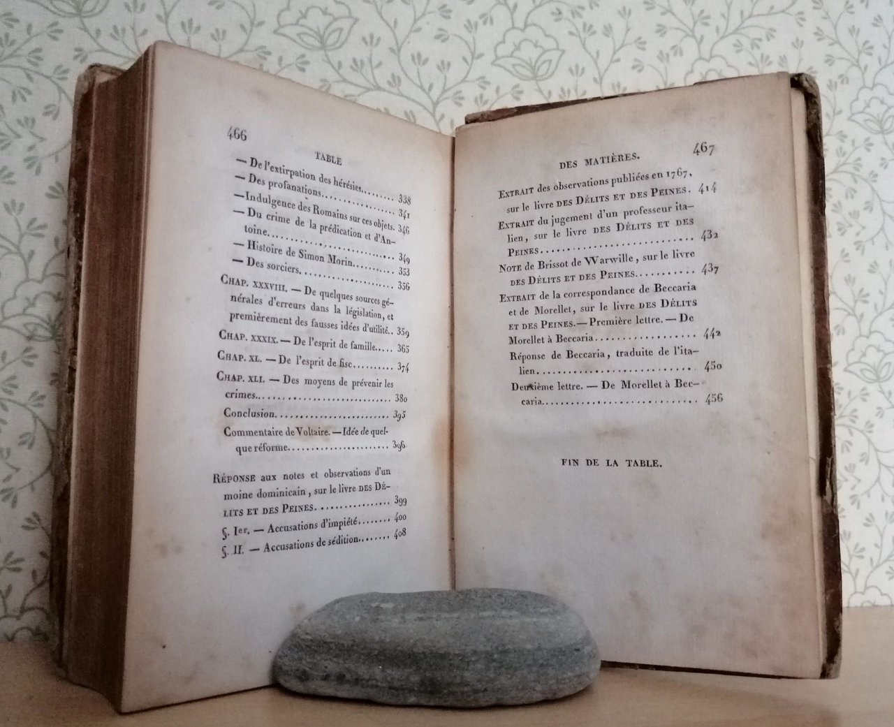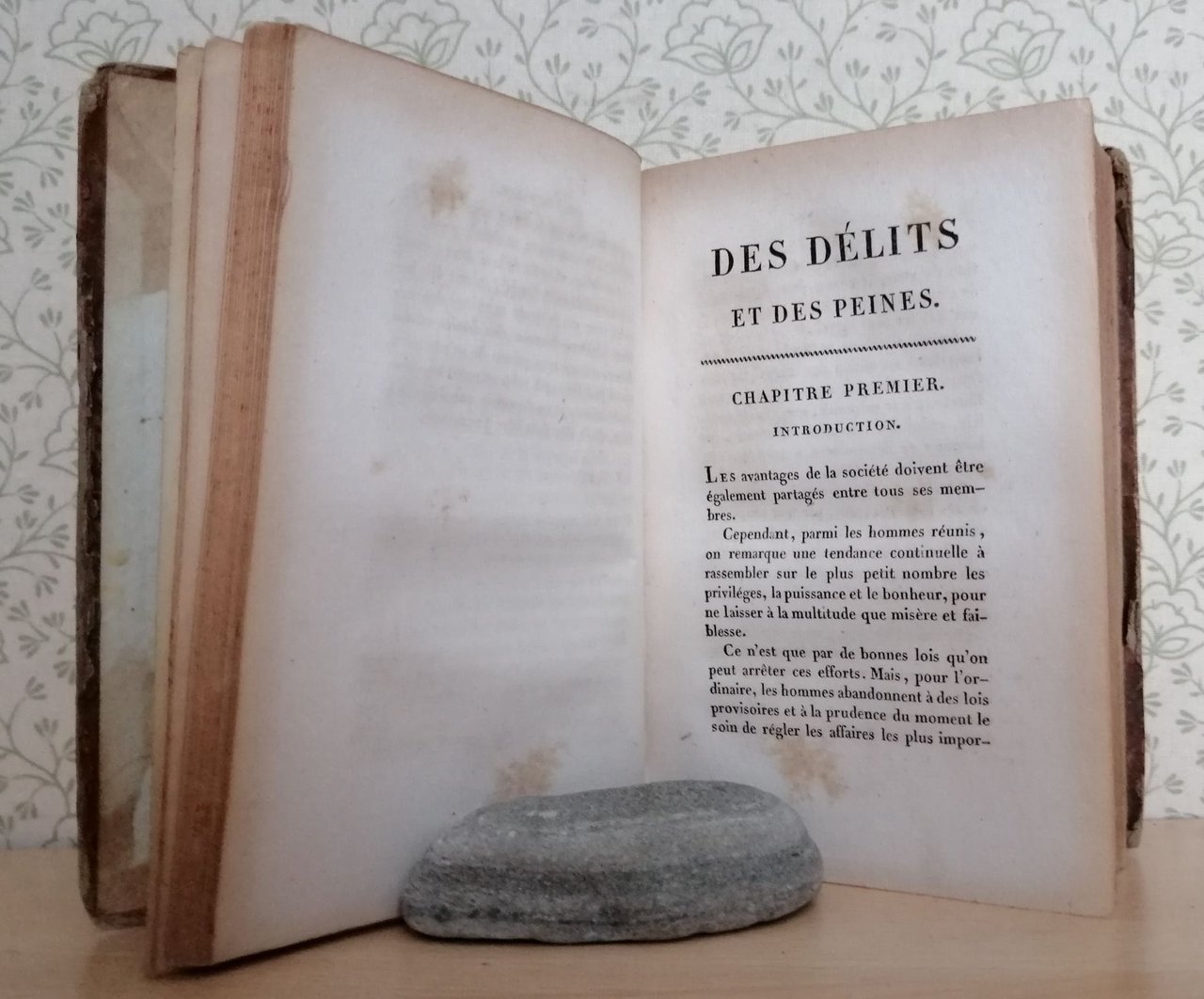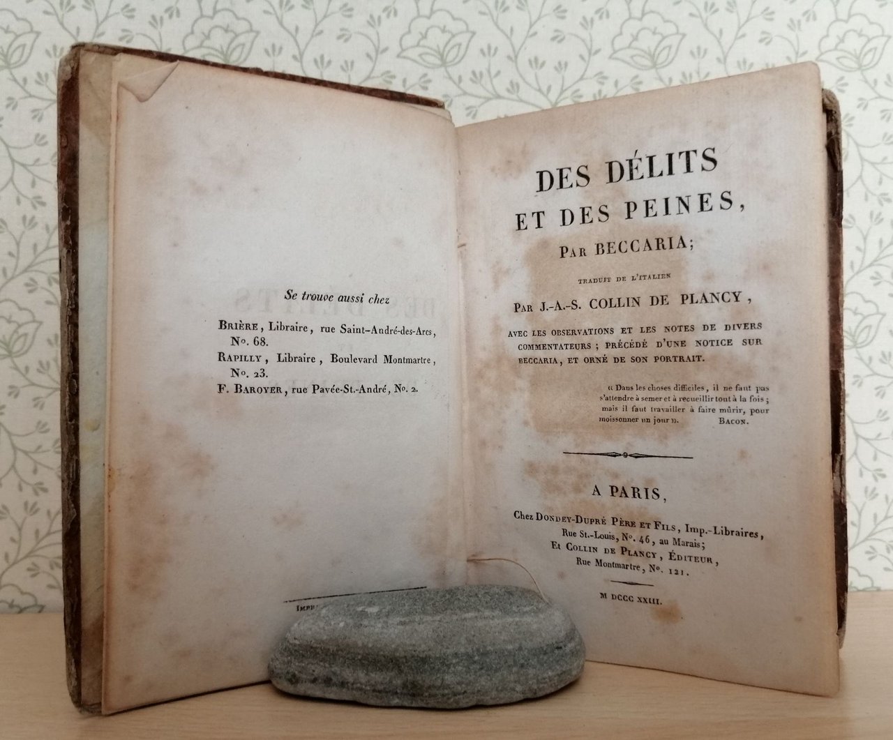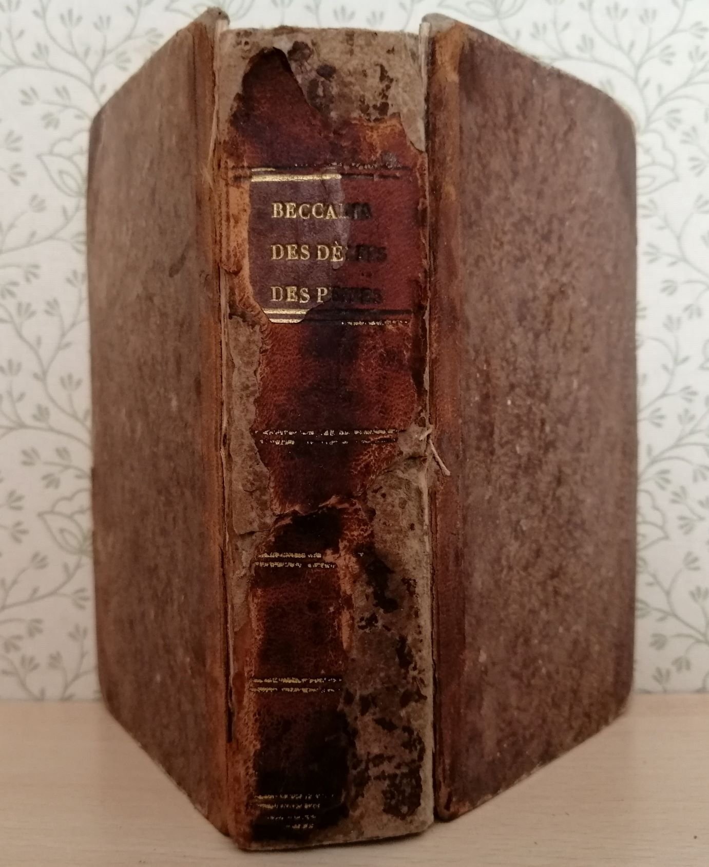 Volume in 12 legato in mezza pelle, titolo al dorso ed al piatto (incollato), sguardia, occhiello, frontespizio, note biografiche, prefazione, XLIII, 467 pp. comprensive di indice. Opera tradotta dell'Italiano da J.A.S. Collin De Plancy con osservazioni e note di diversi autori. Piccole mancanze alla legatura, lieve brunitura della carta. L'immortale opera del Beccaria in corretta edizione francese, scarsamente reperibile.
