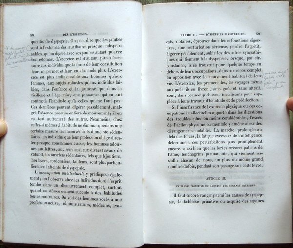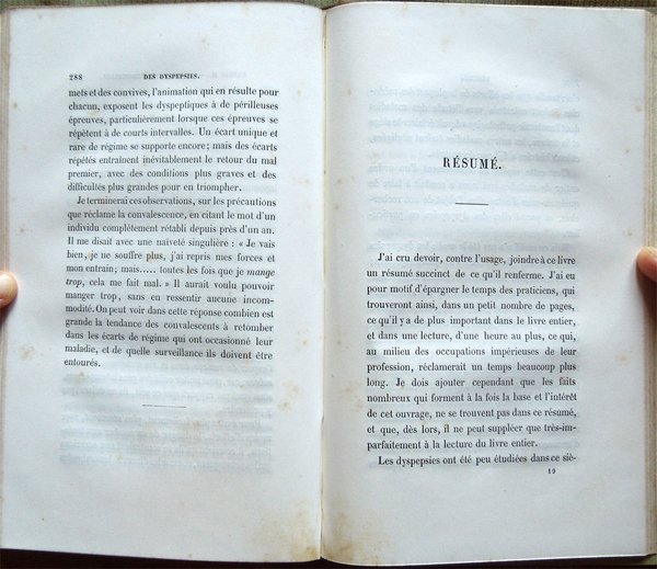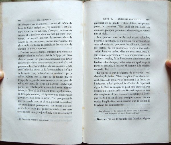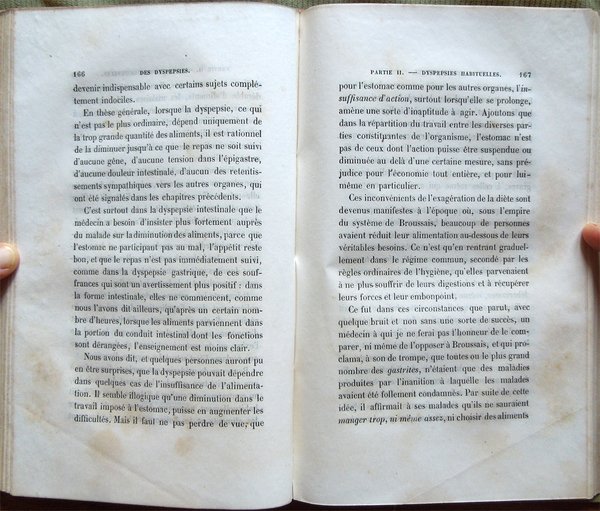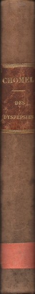 In-8° (21,2 x 13,2 cm), pp. (4), 327, (1), legatura coeva in mezza tela con titoli su tassello al dorso. Normali tracce d'uso e del tempo alla legatura. Qualche piccolo, leggero segno d'umido ad alcune pagine. Alcune note a matita nei margini bianchi di poche pagine. Nel complesso, esemplare ben conservato. Edizione originale. Table des dyspepsies: Considérations générales sur les dyspepsies. Première partie. Des dyspepsies accidentelles ou indigestions. Chap. I. Définition; Chap. II. Des causes de l'indigestion; Chap. III. Symptômes; Chap. IV. Traitement de l'indigestion. Deuxième partie. Des dyspepsies habituelles. Chap. I. Définition; Chap. II. Des causes des dyspepsies habituelles; Chap. III. Des symptômes de la dyspepsie habituelle; Chap. IV. De quelques formes spéciales de la dyspepsie; Chap. V. Marche des affections dyspeptiques; Chap. VI. Du diagnostic des dyspepsies; Chap. VII. Pronostic; Chap. VIII. Traitement des dyspepsies habituelles; Chap. IX. De la convalescence. Résumé.