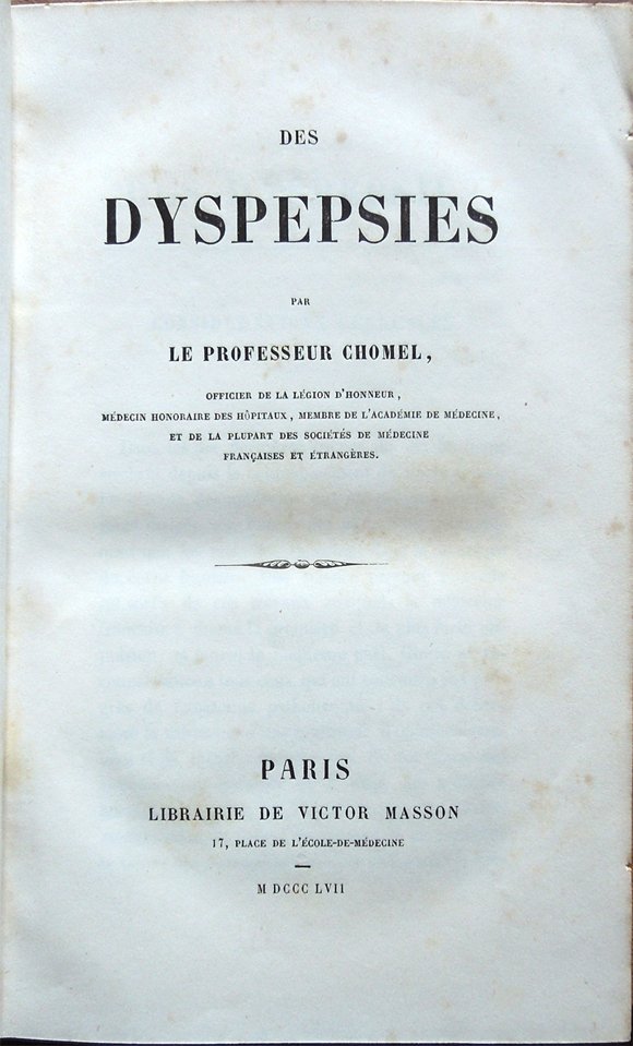 Des dyspepsies par le Professeur Chomel, Officier de la Légion d'Honneur, Médecin honoraire des Hôpitaux, Membre de l'Académie de Médecine et de la plupart des sociétés de médecine françaises et étrangères