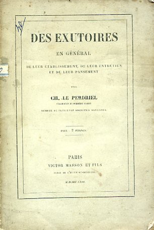 In-8°, pp. 80, brossura editoriale verdina con titolo entro duplice filetto. Bell'esemplare. Edizione originale ed unica. Memoria medica sulle ulcere artificiali utilizzate come derivativo per permettere gli sfoghi dei liquidi organici.