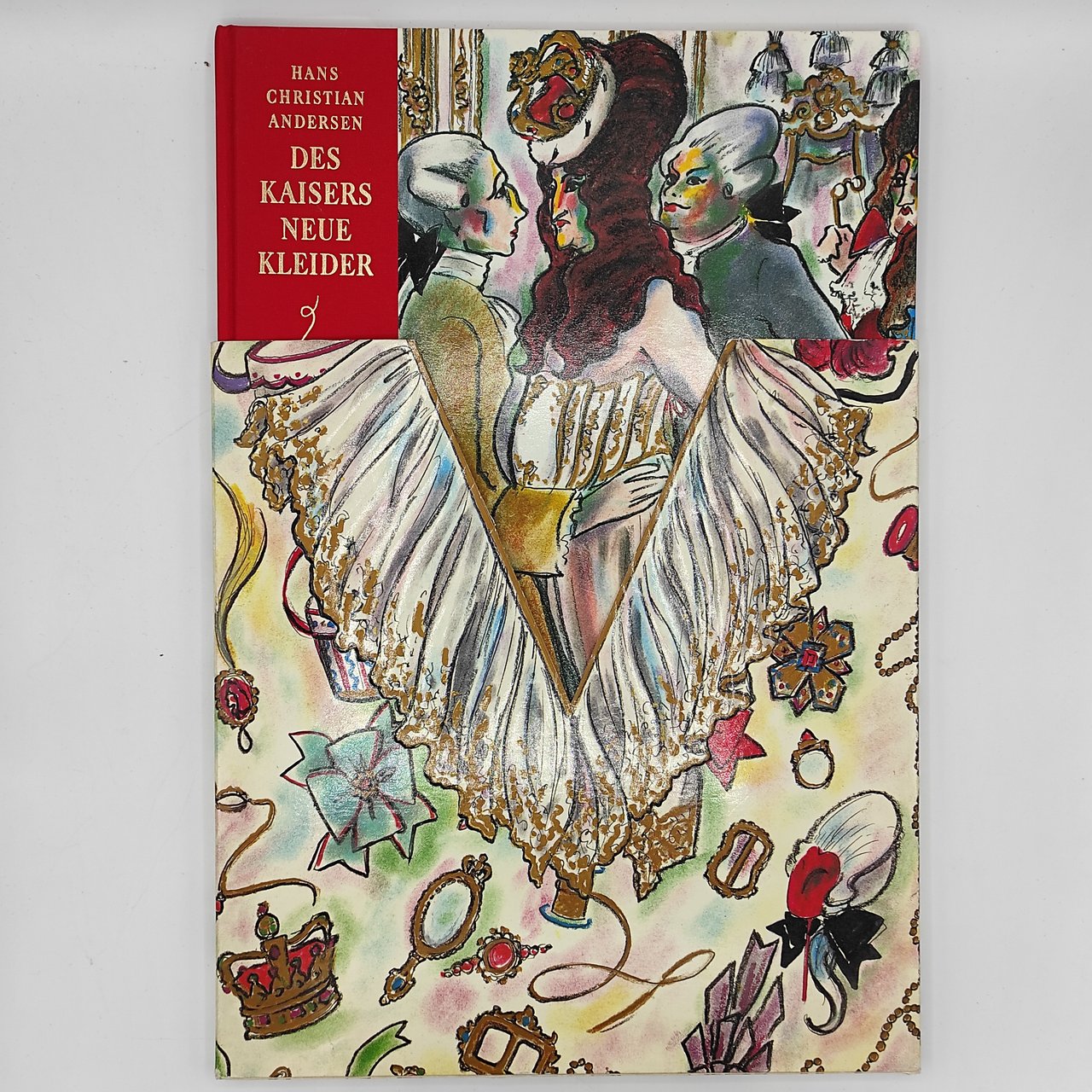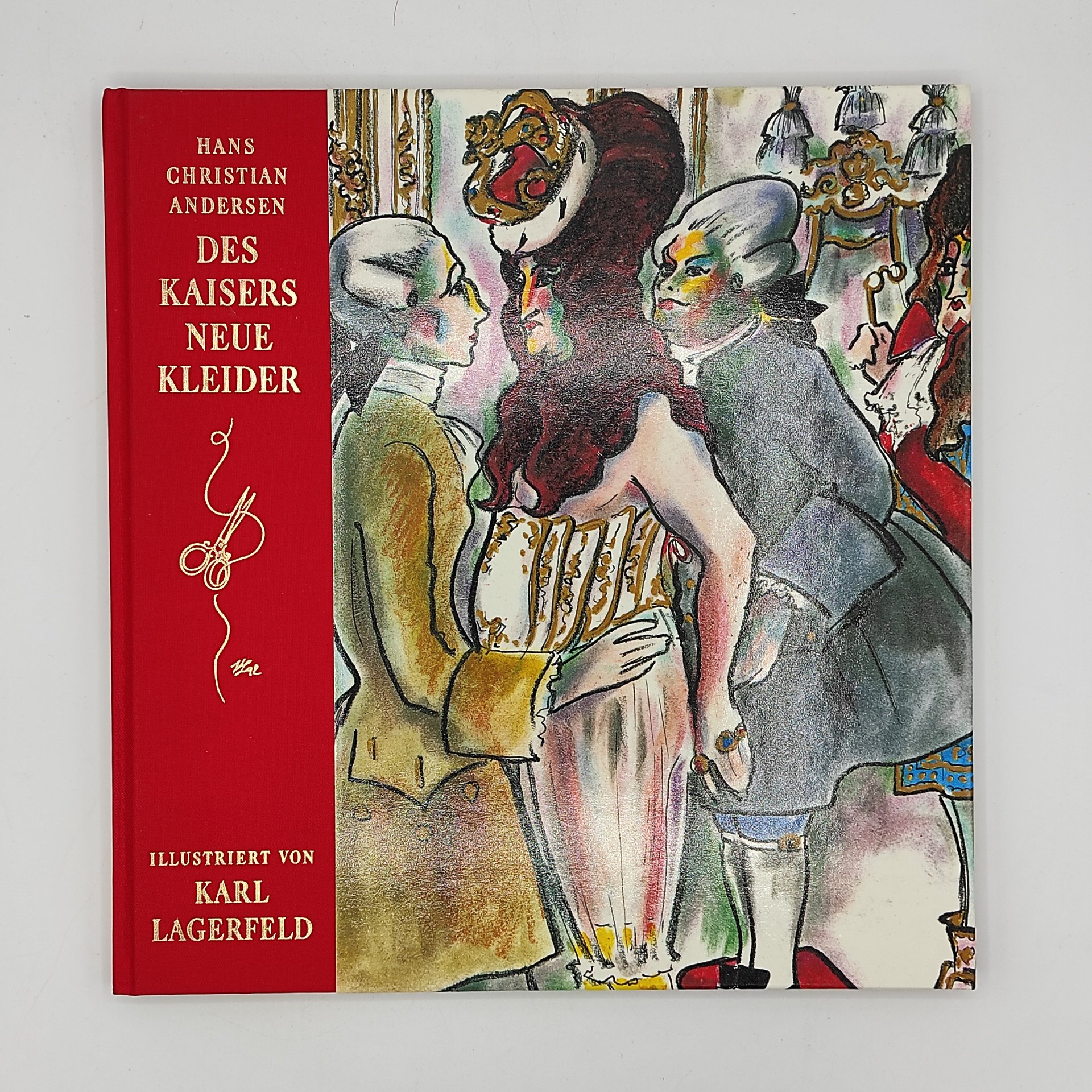 Edizione con numerose illustrazioni a colori a piena pagina e nel testo, legatura editoriale in mezza tela rossa, illustrata a colori e con autore, illustratore e titolo impressi in oro, segnapagine raso rosso con alle stremità un paio di forbici dorate, custodia editoriale in cartoncino illustrata a colori. Elegante edizione della celebre favola di Christian Andersen illustrata dall'iconico stilista Karl Lagerfeld. Lingua tedesca. Copia pari al nuovo.