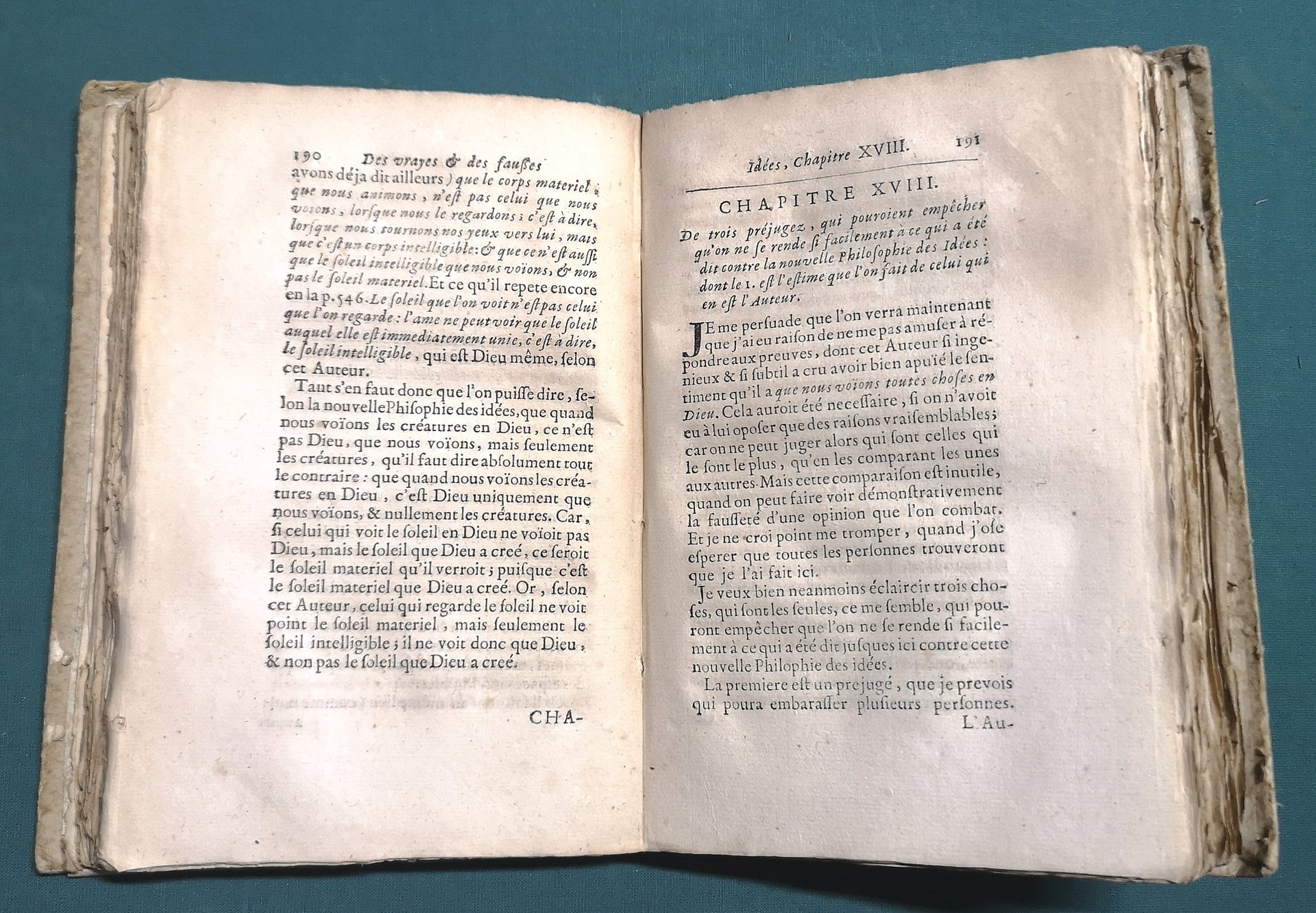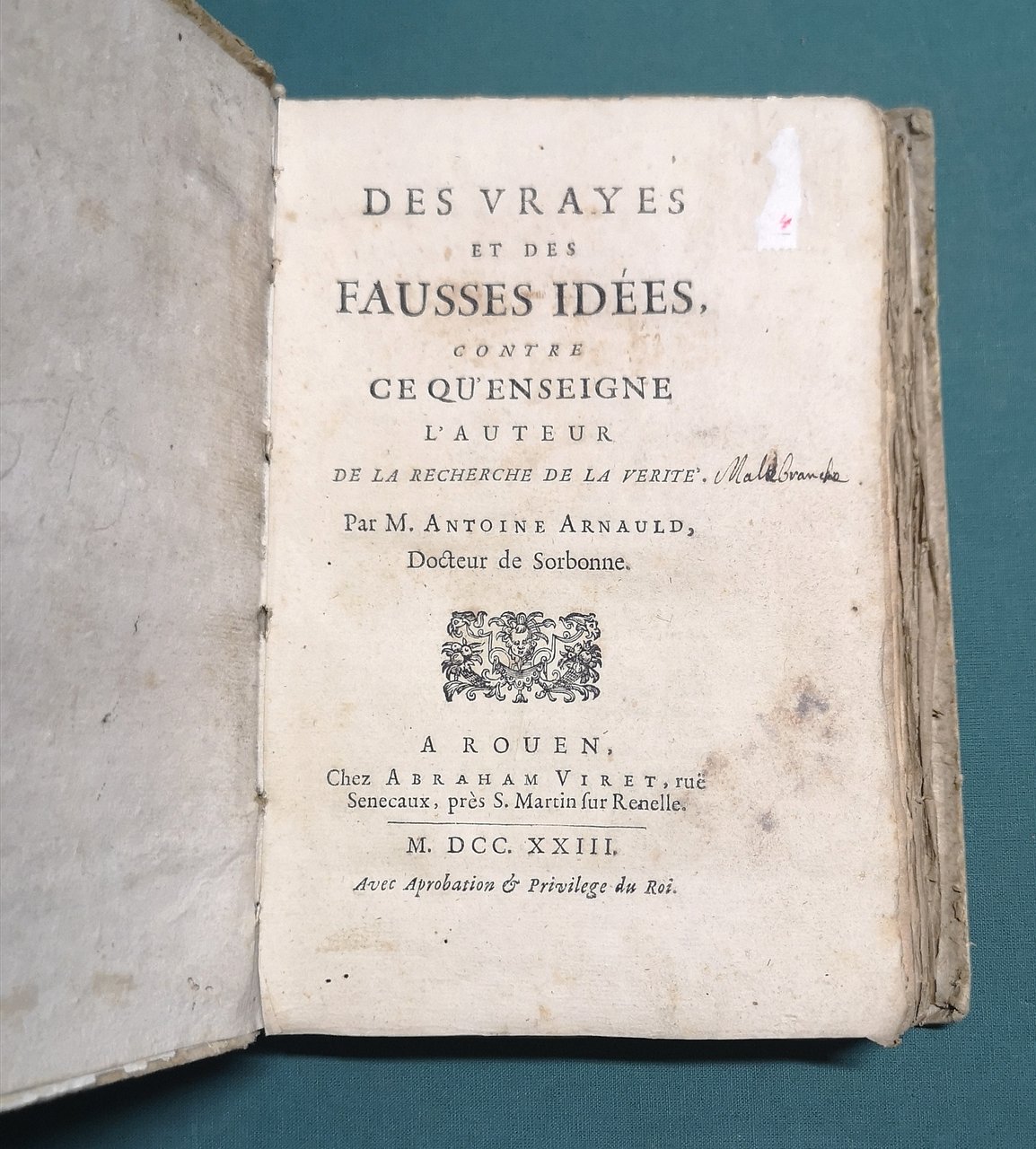 >in-8, pp. (4), 352, (4), legatura in cart. rustico coevo, titolo ms. su tassello in carta al dorso. Edizione settecentesca (prima ed. 1683) della nota polemica filosofica tra Aranauld e Malebranche. Buon esemplare, sporadiche e minime bruniture.