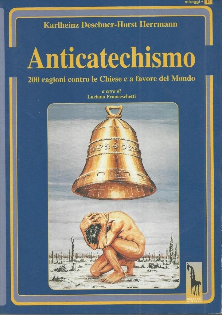 Karlheinz Deschner, Horst Herrmann, Anticatechismo. 200 ragioni contro le Chiese e a favore del Mondo, traduzione e cura di Luciano Franceschetti, Massari editore, Bolsena 2002, prima ed., pp. 159, cm 24, br. ed. Collana Miraggi, vol. 10. Titolo originale: Der Anti-Katechismus. 200 Grunde gegen die Kirchen und fur die Welt. Leggere tracce d’uso, per il resto buona copia.