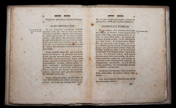 In 4° (21,5×17 cm); 118, (2 b.) pp. e 137, (1) pp. Legatura coeva in pieno cartoncino molle con titolo manoscritto da mano coeva al dorso. Esemplare con leggerissima brunitura omogenea dovuta alla qualità della carta tedesca nel primo volume e nel complesso in ottime condizioni di conservazione ancora a fogli chiusi. Due prime edizioni non comuni, tre soli esemplari censiti in ICCU della prima opera e due sole della seconda, del noto medico tedesco Ferdinand Saalmann (1732-1792) che visse e lavorò a Munster. Molto apprezzato dalla comunità locale fu medico e consigliere medico ufficiale del vescovado di Munste. Fu autore di diversi studi medici dedicati a diversi tipi di infiammazioni. La prima opera è dedicata alle febris urticatae come la scarlattina e la febbre rossa (probabilmente la Febbre emorragica o Dengue). La seconda opera è invece dedicata alle febbri maligne come la Peste, il Tifo e la Rabbia. Prime rare edizioni in ottime condizioni.