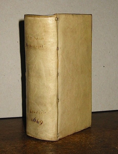 16mo (cm. 11,2), 24 cc.nn. (compreso frontis. interamente inciso), 267(1) pp. (i.e. 287), (segue con proprio frontis.) Idem, Tractatus in quo agitur. De Iaponiorum religione. De Christianae religionis introductione in ea loca. De ejusdem extirpatione., ibidem 1649, 4 cc.nn., 120 pp. (i.e. 320). Legatura coeva in pergamena rigida con titolo ms. al ds. (sbiadito) e unghie. Tagli scuri. Assente la tabella rip. f.t. Ottimo esemplare. Edizione originale. Willems, 1095.