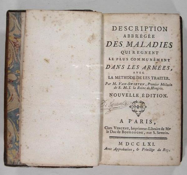 Paris, Vincent, 1761. In/12. 271 pages, (5), Reliure plein cuir d'époque. Dos lisse orné. Nouvelle édition. De la page 220 à la page 271 table des médicaments soit 52 pages, 24 maladies décrites, 71 formules de pharmacie en latin et en français.