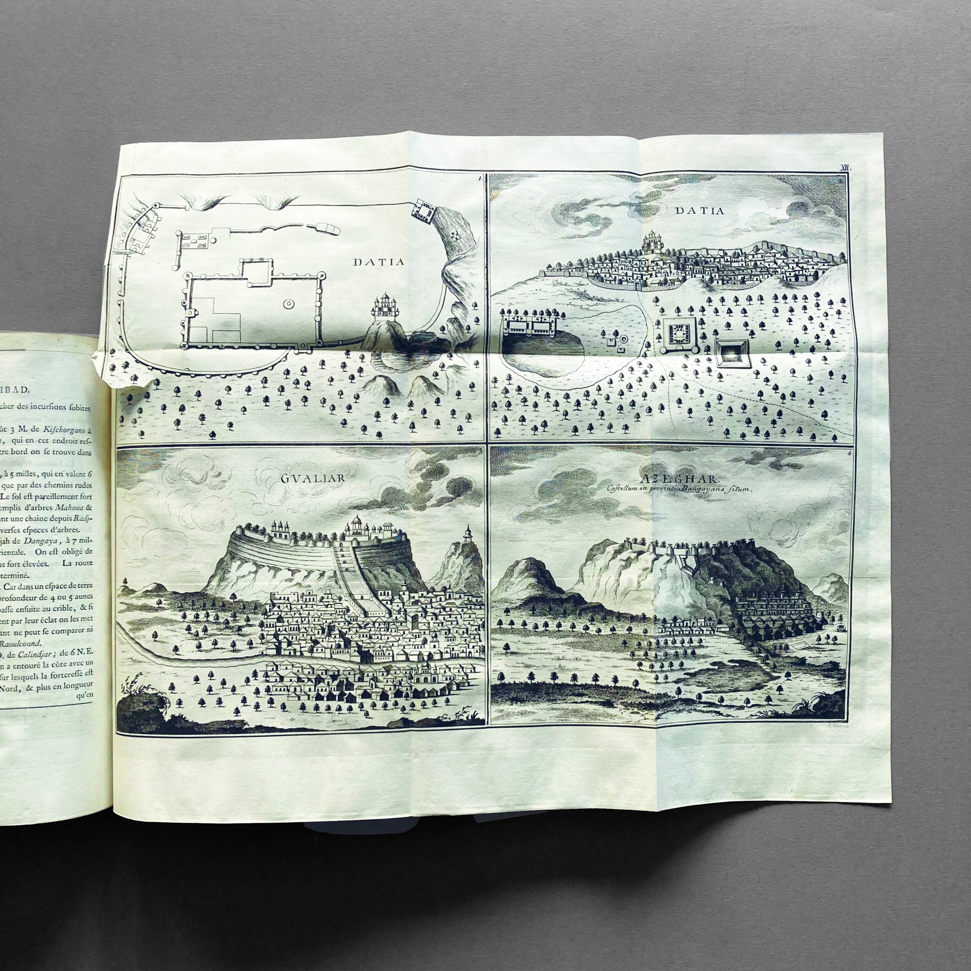 4°, cm 27, due volumi di pp. XVI, (2), 516, con 38 tavole incise e ripiegate; e pp. (2), LXXXIV, (6), 256 con 7 tavole di cui tre carte geografiche ripiegate. Legature coeve in piena pelle con dorsi riccamente decorati in oro, piatti in cornice (un poco lisi). Stampato su carta forte con mappe nitidamente incise. Importante opera corale, una delle prime dedicate completamente all'India, diretta da Jean Bernoulli. Nella prima parte appare la geografia dell'Indostan tradotta dal latino al francese dal padre gesuita Joseph Tieffenthaler, nel terzo volume una grande carta generale dell'India con due tavole sul corso del fiume Brahmapoutren con il relativo commento di James Rennel, geografo inglese pioniere dell'oceanografia e fondatore della Società Geografica Reale. Manca il volume due di pp. 596 con 10 tavole, 3 tabelle e 2 carte, contenente le ricerche storiche e geografiche di Anquetil du Perron, e della seconda parte del volume tre, sostanzialmente un'appendice di memorie storiche di vari autori, con 8 tavole. L'opera completa consta di 68 tavole, il nostro set ne conta 45. I volumi presenti sono completi e in ottimo stato di conservazione. Bibliografia: Sommervogel, VIII, 22; Brunet, I, 803.