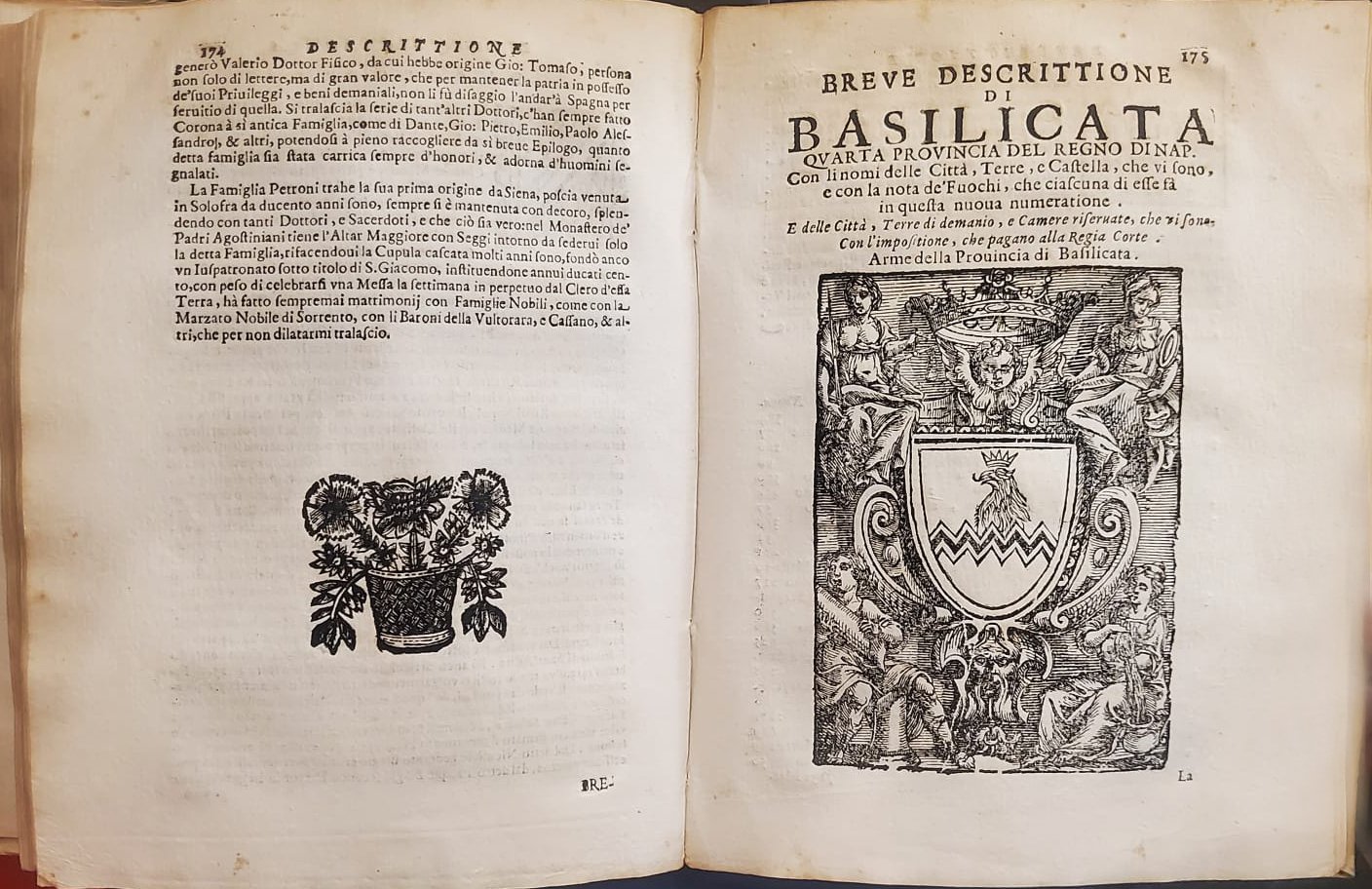 (Regno di Napoli-Fig. ‘600) D’ENGENIO C. Cesare -BELTRANO Ottavio. Descrittione del Regno di Napoli diviso in dodeci provincie, Nella quale con brevità si tratta della Fedelissima Città di Napoli, e delle cose più notabili di essa, e delle Città, e Terre più illustri del Regno, con le Famiglie Notabili, non solo di quella, ma dell’altre Città di esso Regno... Napoli, O. Beltrano, 1671. In-8°, leg. p. perg. antica, con titolo calligr. al dorso, pp. (10)-294 (erroneamente numerate 288) con molte incisioni in legno che raffigurano gli stemmi dei seggi di Napoli e delle Province, testatine, finalini, iniziali ornate. Preziosa edizione di questa rara opera storica-araldica. Cfr. Lozzi, 1975.