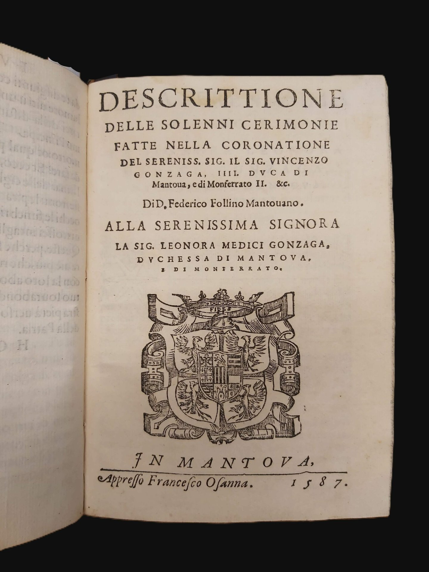DESCRITTIONE DELL'INFIRMITA', MORTE ET FUNERALI del Sereniss. Sig il Sig. Guglielmo Gonzaga III Duca di Mantova e di Monferrato I. Con quelle de le solenni Cerimonie fatte nella coronatione del Sereniss. Sig. il Sig. Duca Vincenzo suo figlio e successore. Insieme con le Orationi recitate in ciascuna di queste attioni. Et con la raccolta di quante Compositioni Volgari e Latine sin'ad hora sono sopra ciò uscite. Mantova, Osanna, 1587. Unito: MAURO Ferrando. ORATIO IN FUNERE Sereniss. Gulielmi Gonzagae. Prima die habita. in Sacro Sanctae Barbarae Templo Mantuae. Mantova, Osanna, 1587. Unito: EVOLA Flaminio. ORATIO IN FUNERE Serenissimi Gulielmi Ducis Mantuae. Mantova, Osanna, 1587. Unito: CAPILUPI Ippolito. SERENISSIMI GULIELMI GONZAGAE