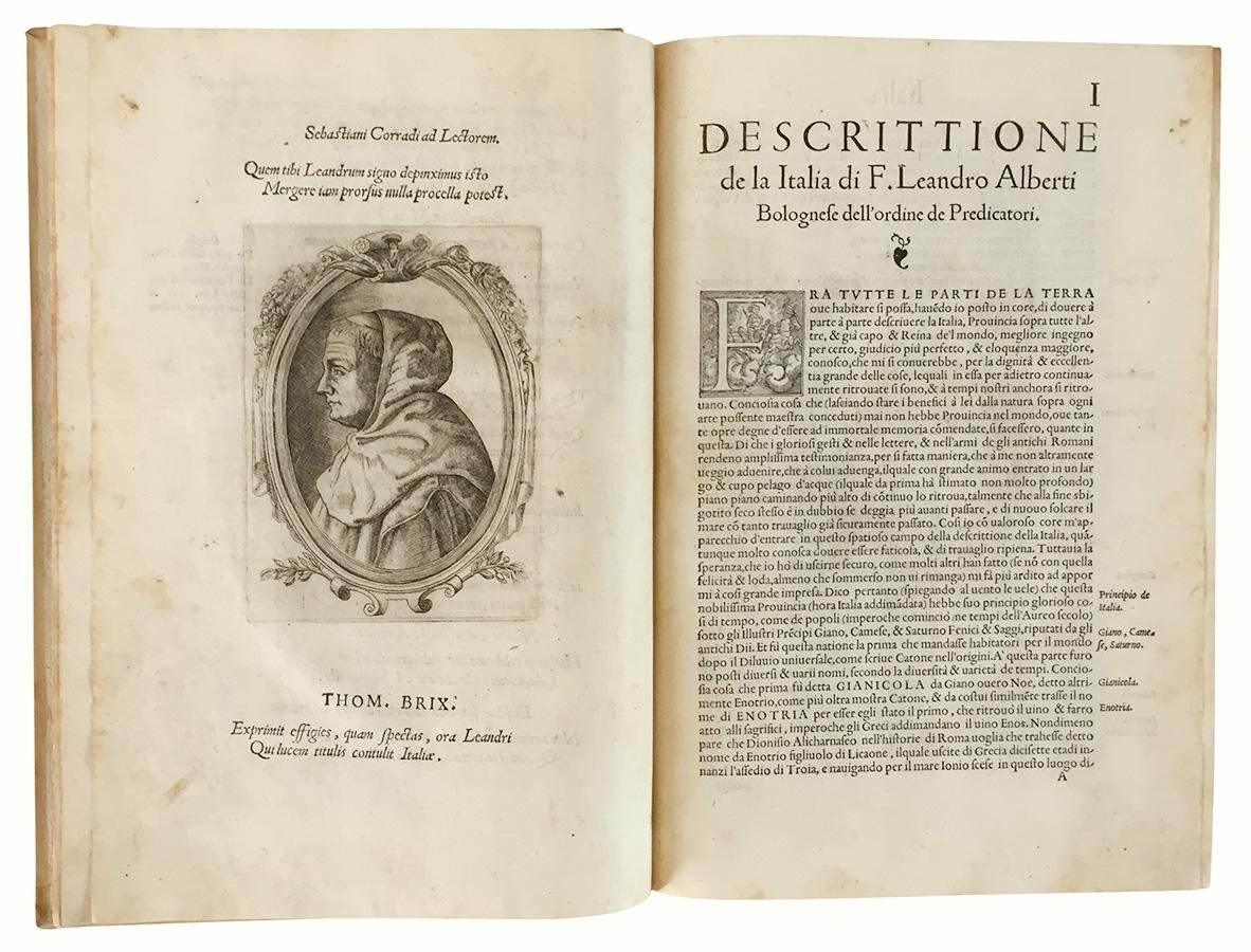 Prima edizione, dedicata dal domenicano Leandro Alberti ad Enrico II di Francia e Caterina de' Medici. Si ispira al modello dell'Italia Illustrata di Flavio Biondo, da cui si differenzia per l'uso accurato delle fonti e per una migliore chiarezza di esposizione, oltre che per il fatto che è soprattutto frutto delle esperienze dirette dell'autore acquisite nei suoi numerosi viaggi attraverso la penisola. L'importante guida storica, artistica e geografica dell'Italia di Alberti divenne un vero e proprio bestseller, letto e consultato fino alla fine del XVIII secolo da molti viaggiatori durante il Grand Tour. Nell'edizione del 1568 furono aggiunte sette mappe delle isole.