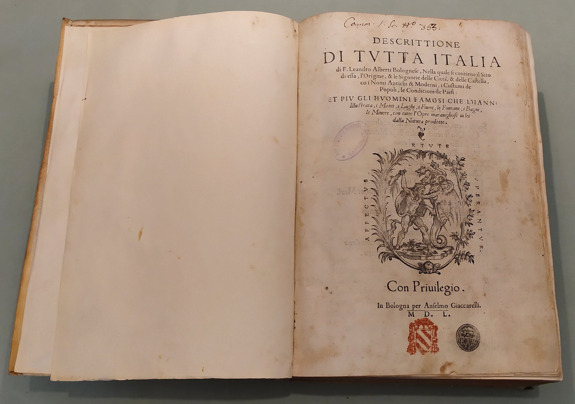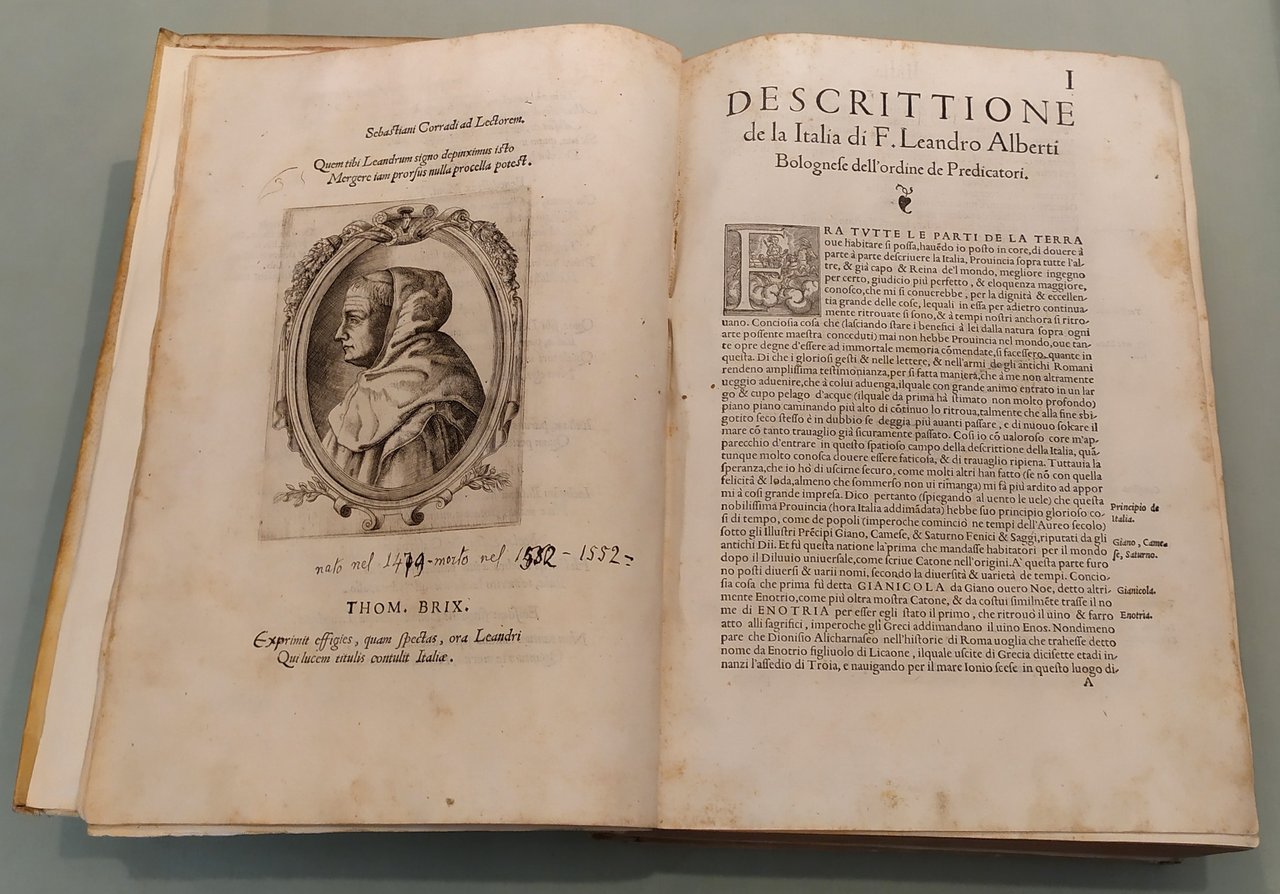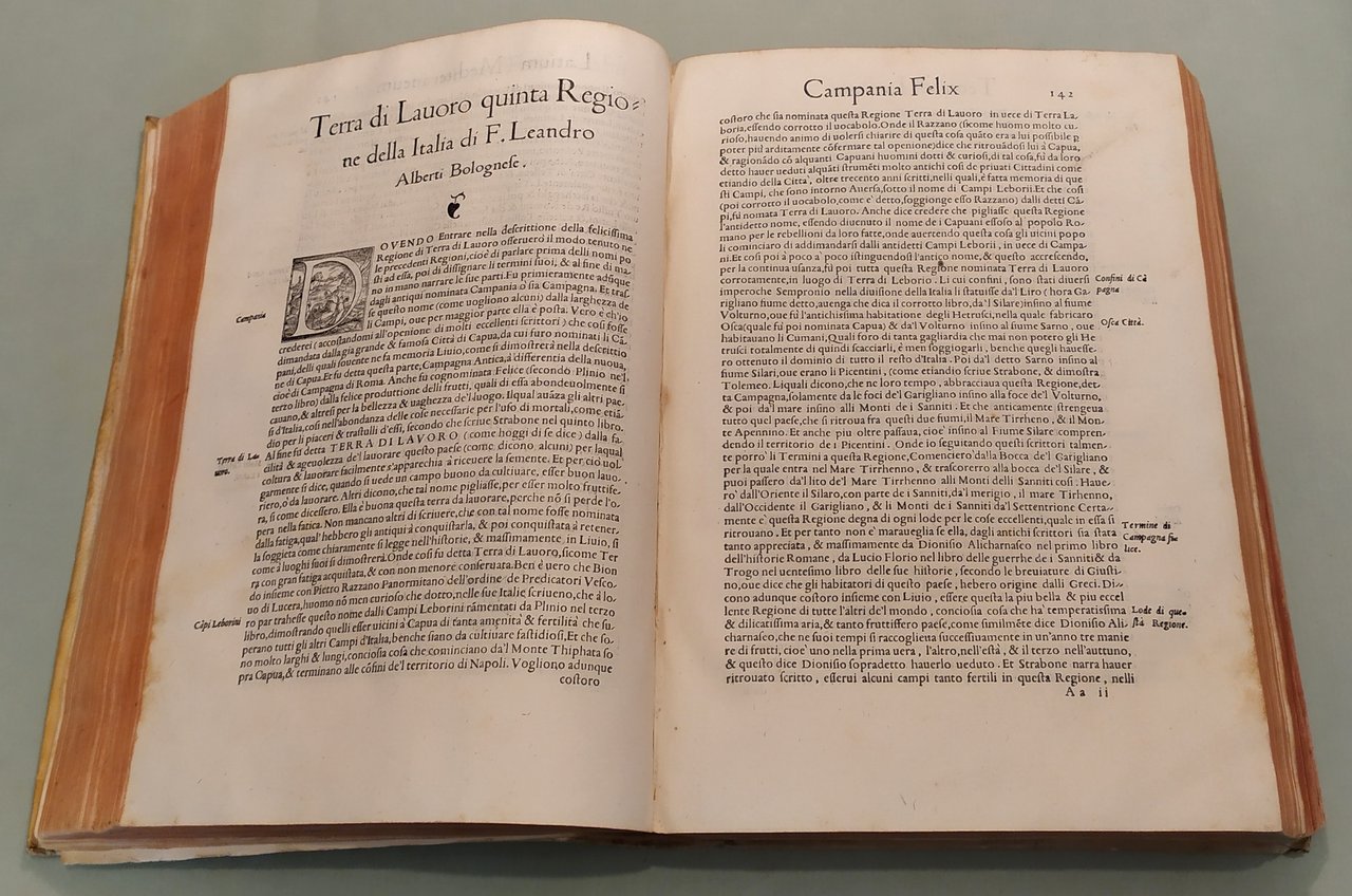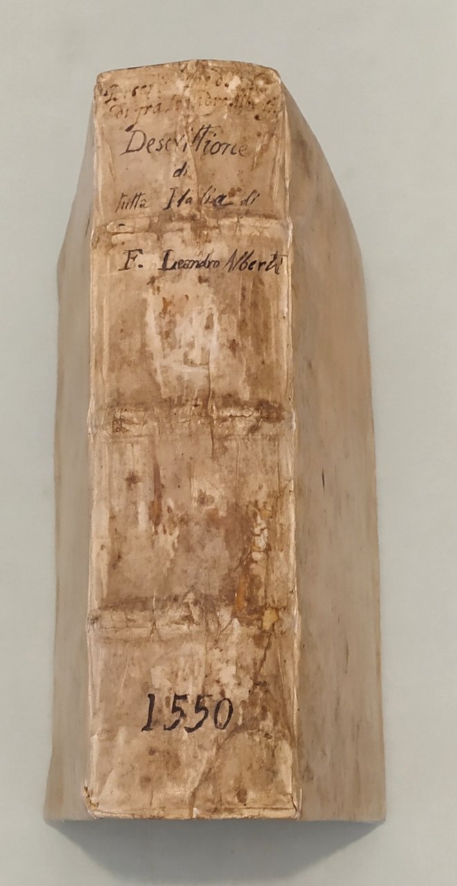 Descrittione di tutta Italia. In Bologna, Anselmo Giaccarelli, 1550. In 4to; cc.4n.nn., 469, le prime otto carte con numerazione romana, la carta otto è bianca, 28n.nn. Marca tipografica al frontespizio. Ritratto in ovale dell’autore alla quarta carta. Capilettera silografati. Pergamena coeva, titolo calligrafato al dorso. Tagli rossi. Edizione originale.