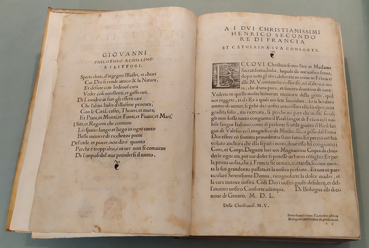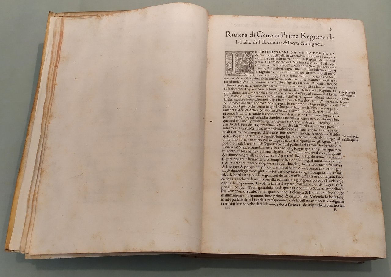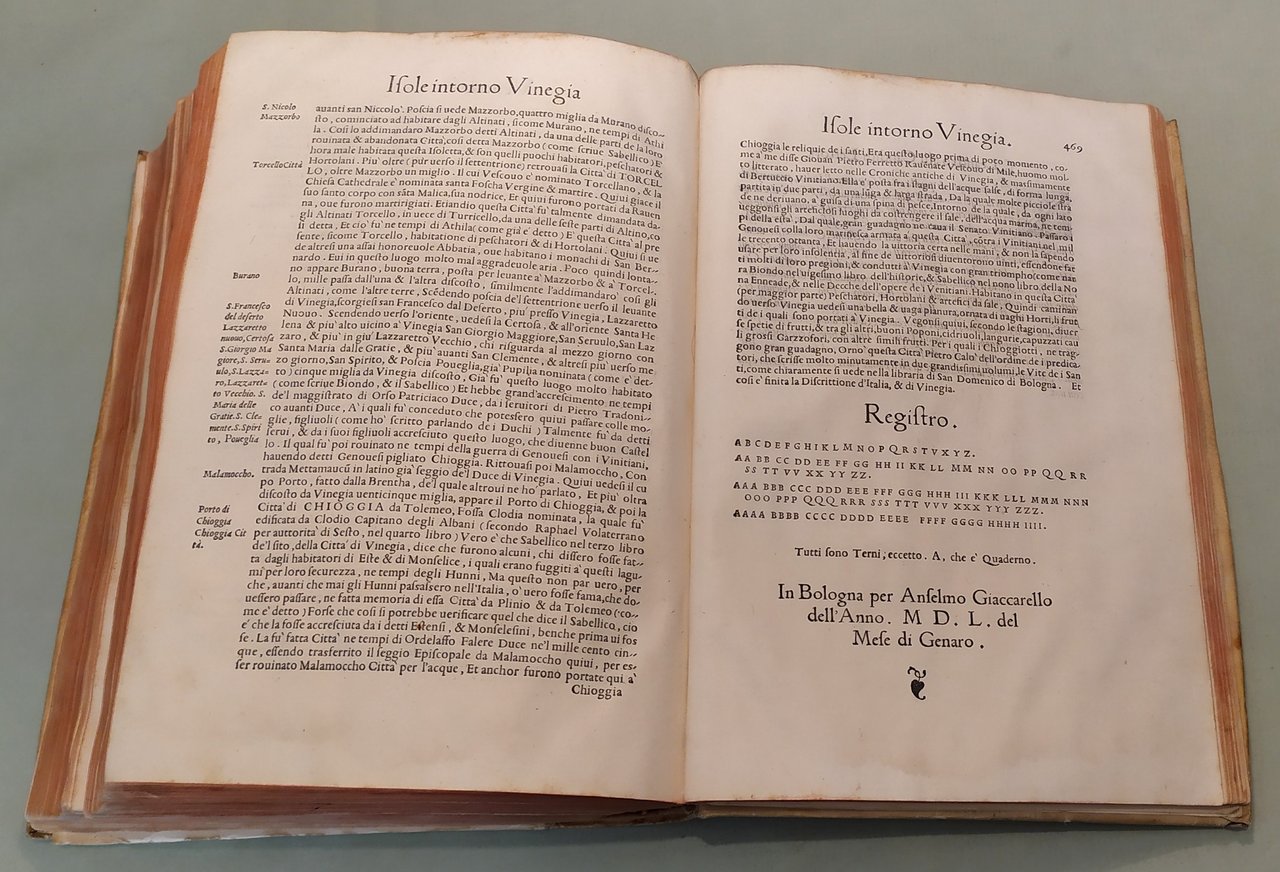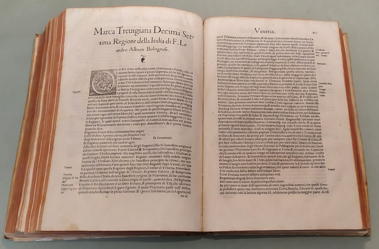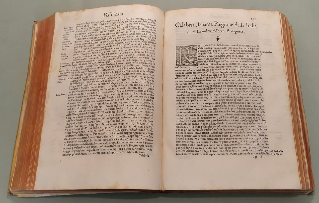 Descrittione di tutta Italia. In Bologna, Anselmo Giaccarelli, 1550. In 4to; cc.4n.nn., 469, le prime otto carte con numerazione romana, la carta otto è bianca, 28n.nn. Marca tipografica al frontespizio. Ritratto in ovale dell’autore alla quarta carta. Capilettera silografati. Pergamena coeva, titolo calligrafato al dorso. Tagli rossi. Edizione originale.