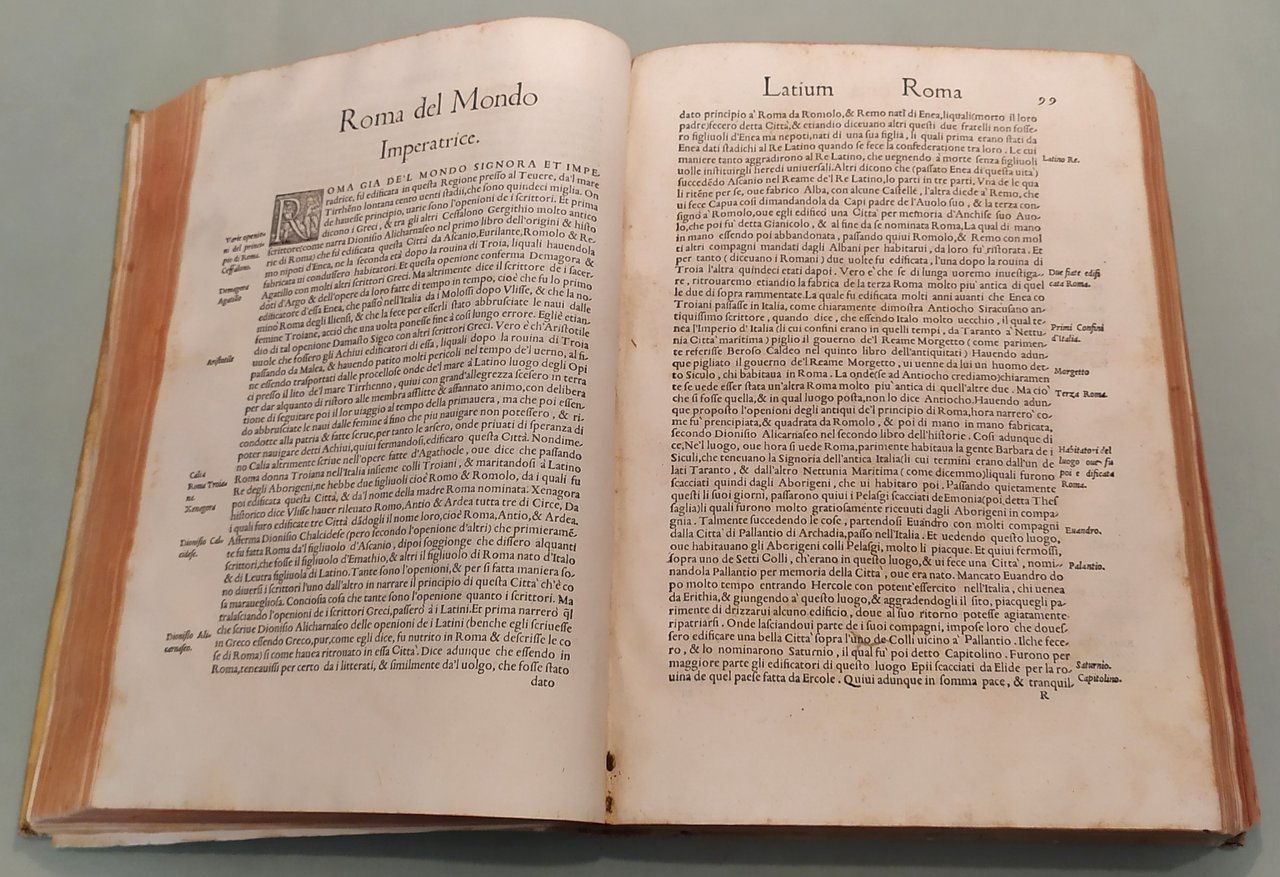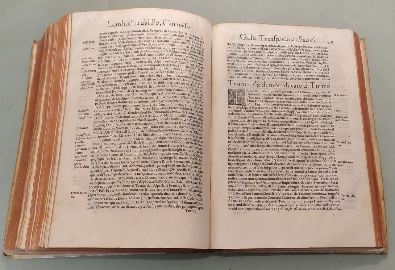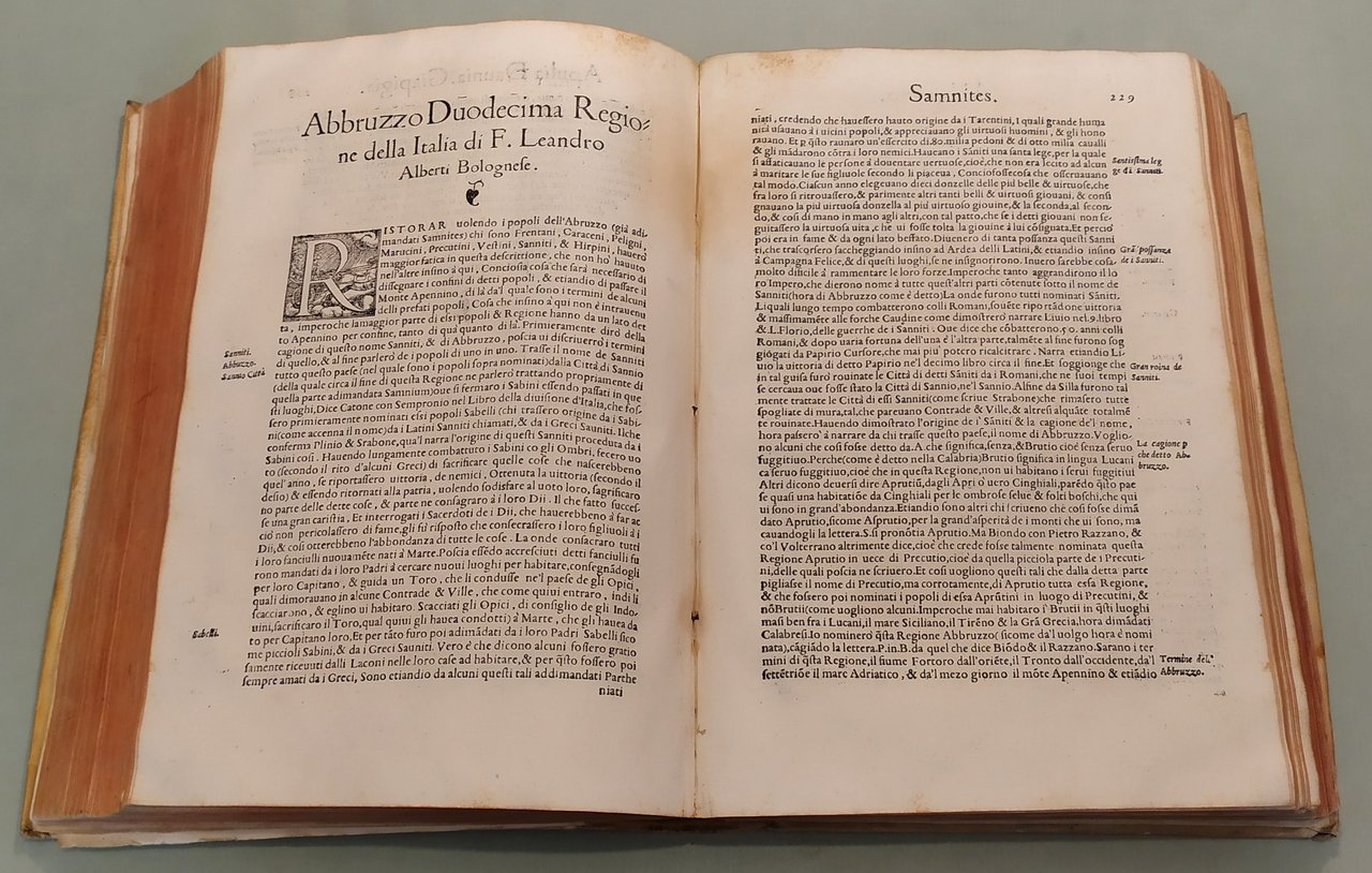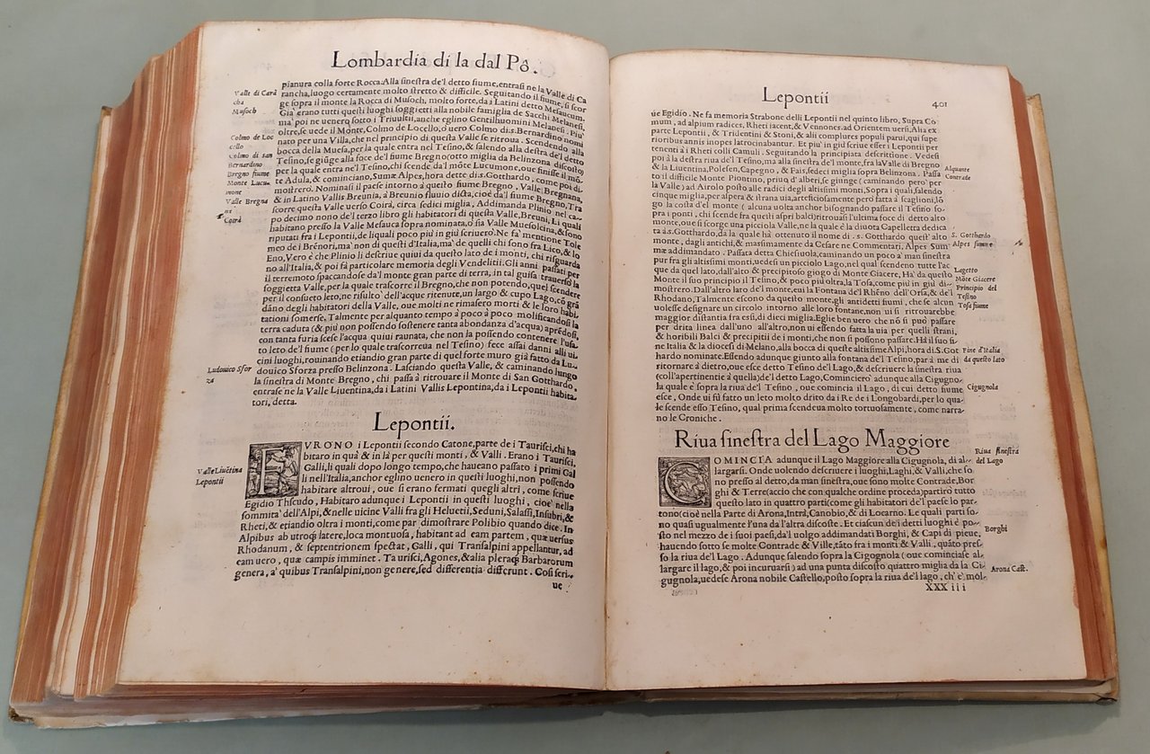 Descrittione di tutta Italia. In Bologna, Anselmo Giaccarelli, 1550. In 4to; cc.4n.nn., 469, le prime otto carte con numerazione romana, la carta otto è bianca, 28n.nn. Marca tipografica al frontespizio. Ritratto in ovale dell’autore alla quarta carta. Capilettera silografati. Pergamena coeva, titolo calligrafato al dorso. Tagli rossi. Edizione originale.