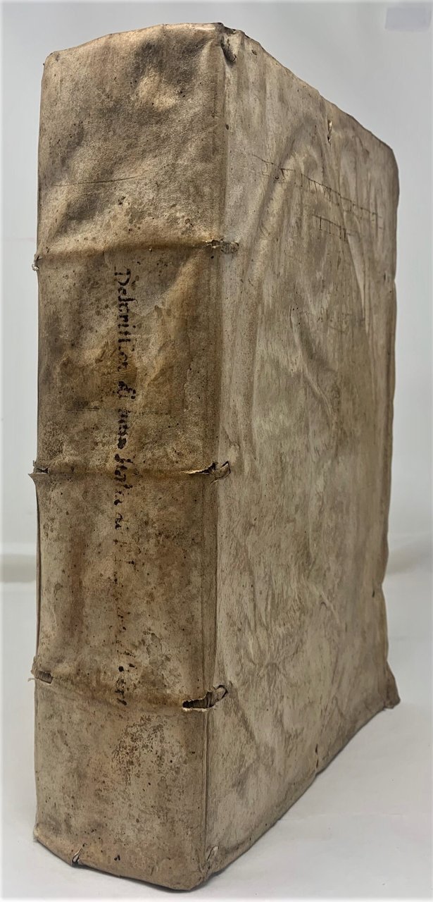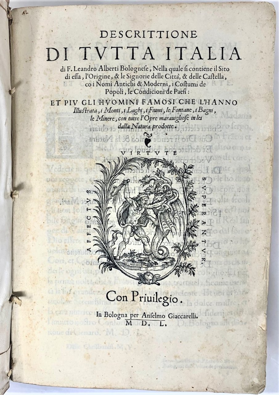 >in-4 (mm302x210), ff. (4), 469 (i primi 7 in numerazione romana, il f. 8 b.), 1 bianco, (28), perfetta legatura in piena pergamena floscia coeva con titolo manoscritto al dorso e al piatto superiore. Impresso in elegante grande carattere tondo, bella impresa tipografica al titolo, ritratto in medaglione sul quarto foglio, iniziali istoriate. Dedica dell'autore ai sovrani di Francia Enrico II e Caterina de' Medici. Prima edizione, la più bella e la più stimata, di quest'opera importante di carattere geografico, ma parimenti ricchissima di notizie sulla storia, gli usi ed i costumi, sulle curiosità naturali delle singole regioni dell'Italia peninsulare e delle isole. la più bella e la più stimata, di opera che amplia la Italia illustrata di Flavio Biondo, migliorandola nell'esposizione e nella citazione delle fonti. Di particolare interesse anche per il breve riferimento ai viaggi di Vespucci ed alla scoperta del Nuovo Mondo (f. 43 verso). Rara. Esemplare molto bello, in condizioni molto genuine.