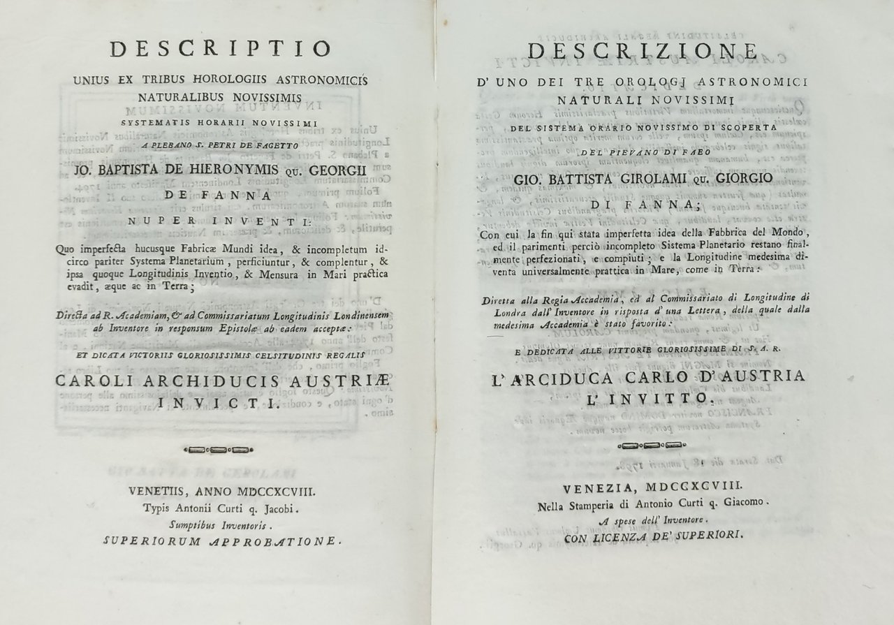 DESCRIZIONE D'UNO DEI TRE OROLOGI ASTRONOMICI NATURALI NOVISSIMI DEL SISTEMA ORARIO NOVISSIMO DI SCOPERTA DEL PIEVANO DI FAEO GIO. BATTISTA GIROLAMI