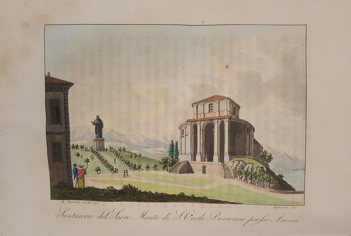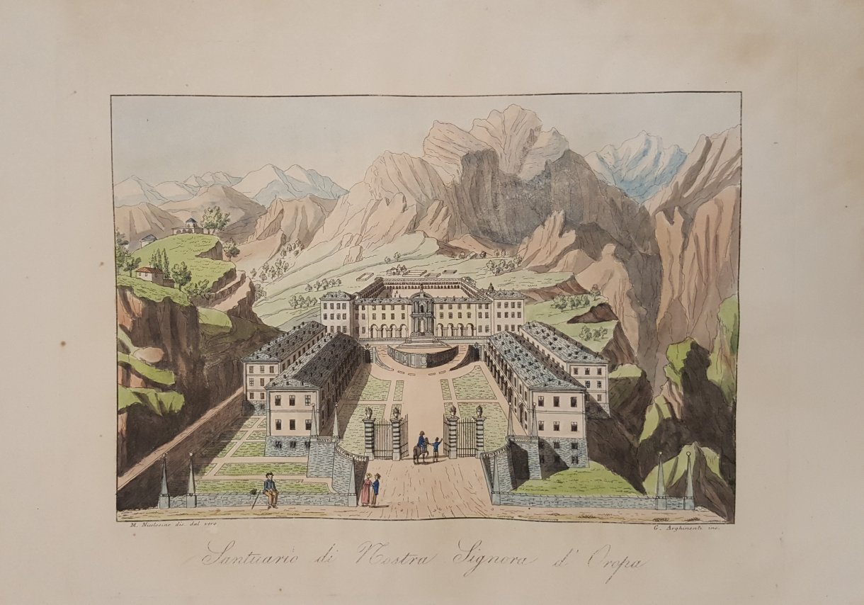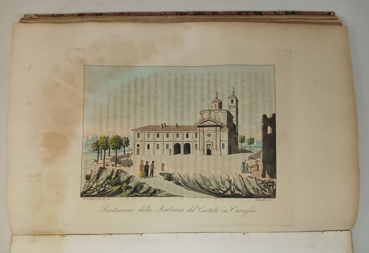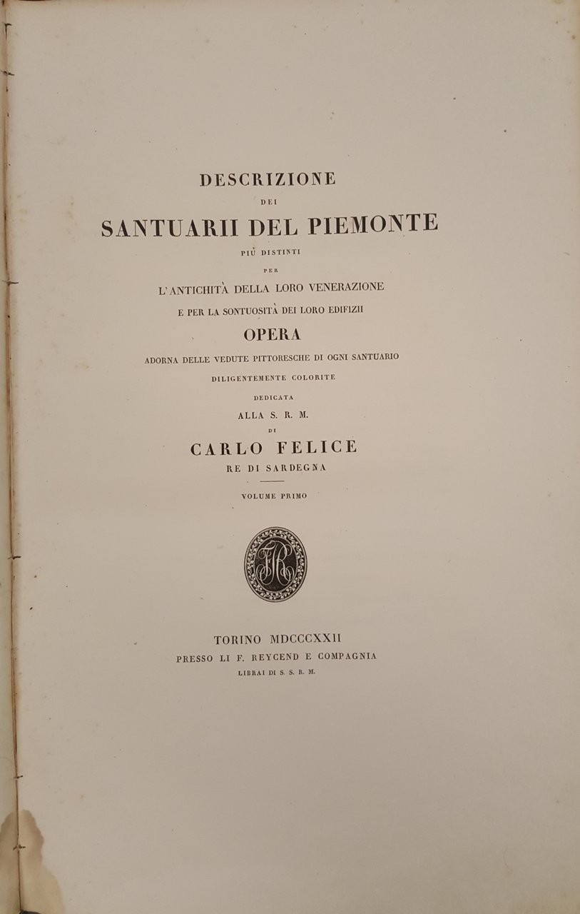 Splendida e dettagliatissima pubblicazione sui Santuari, molti dei quali poco noti nelle valli delle Alpi, del Piemonte, della Savoia e della Liguria. L'opera completa è di difficile reperibilità. L'iconografia è di grande importanza, in quanto illustra alcune località altrimenti mai raffigurate in epoca antica. Frequenti macchie di umidità sparse più forti in una decina di tavole, ma tutte con una buona coloritura dell'epoca.