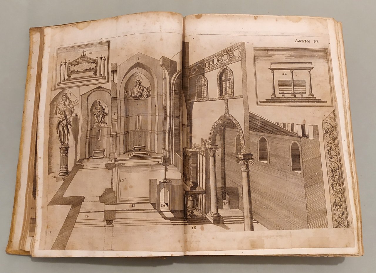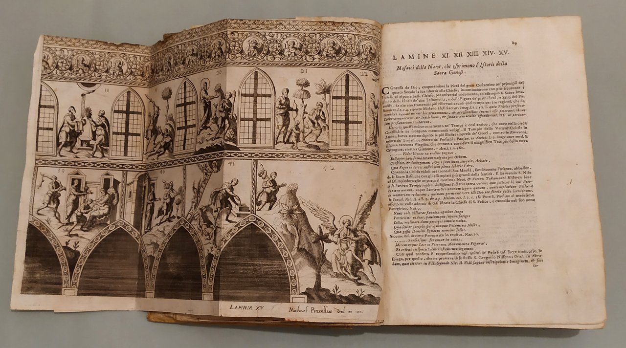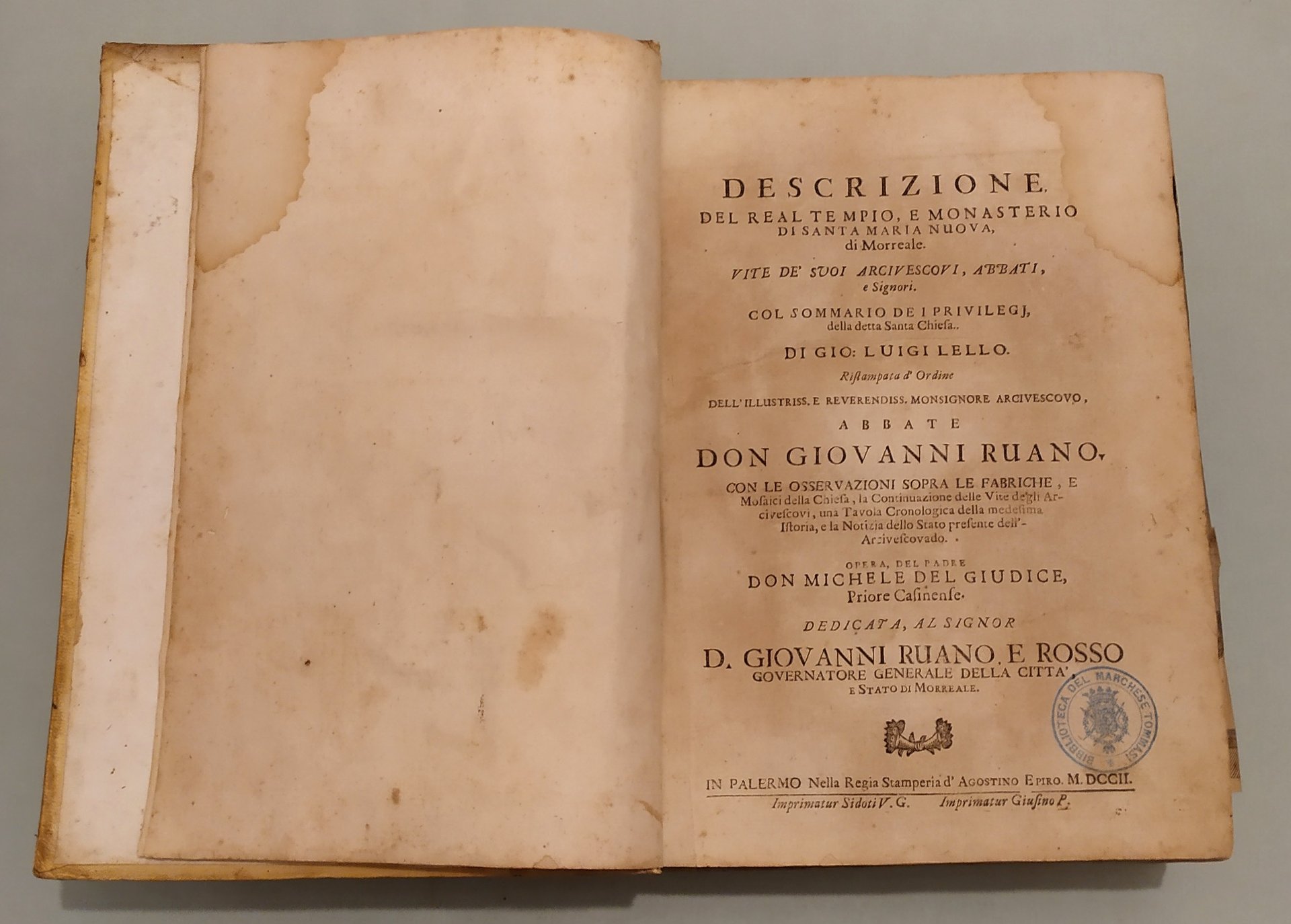 DEL GIUDICE Michele. Descrizione del Real Tempio e Monasterio di Santa Maria Nuova di Morreale. Vite dè suoi arcivescovi, abbati e signori. Col sommario dei privilegi della detta Santa Chiesa di Gio. Luigi Lello ristampata d’ordine dell’Abbate Don Giovanni Ruano con le osservazioni sopra le fabriche e mosaici della Chiesa, la continuazione delle vite degli Arcivescovi, una tavola cronologica della medesima istoria, e la notizia dello stato presente dell’ Arcivescovado. Palermo, Epiro, 1702. In 4to; cc.4n.nn., pp.202; 136; 71; pp.40 (numerate da 23 a 62); cc.28n.nn.; pp.45; 45; 132; cc.2n.nn. In antiporta ritratto in ovale dell’Abbate Don Giovanni Ruano cui l'opera è dedicata. 31 tavole numerate su 33, incise in rame da Gaetano Lazara. Mancano le tavole n. 27 e 29. Sono presenti però 2 tavole non numerate a doppia pagina con i ritratti degli Arcivescovi succedutisi dal 1176 al 1673. Nel “Sommario dei Privilegi” i sigilli del Re Guglielmo II, della Chiesa, della Città e dello Stato di Monreale. In fine vi è l’opuscolo “De raedificatione monasterii”. Coleti avverte credesi comunemente che l’autore di questa descrizione sia l’Arcivescovo Torres, ma il Mongitore l’attribuisce al Lello (Lozzi 2870, nota). Timbro di appartenenza al frontespizio. Tracce d’umido. Lievi fori da tarlo alle prime carte che non intaccano il testo. Bruniture a qualche tavola con rinforzo al verso. Pergamena coeva, titolo calligrafato al dorso. Ex libris. Edita nel 1588 da Zanetti a Roma e di nuovo nel 1596 l’opera di Gian Luigi Lello sulla Basilica di Monreale fu ripubblicata con molte aggiunte da Michele Del Giudice “uno dei principali membri dell' Accademia dei Riaccesi di Palermo. Dall'Arcivescovo di Monreale venne nominato esaminatore sinodale e nel 1710 Abbate dello ordine. Fu uomo straordinario nei lavori letterari, nel 1711 aveva raccolto una quantità di documenti storici siciliani che non potè pubblicare perché nessuno volle prestarsi al suo invito in tutta Italia. Avrebbe preceduto il Muratori e il Caruso, che si giovò dei lavori di lui”. (Mira I, pag. 438). Edizione assai rara. Narbone I, pag. 287.