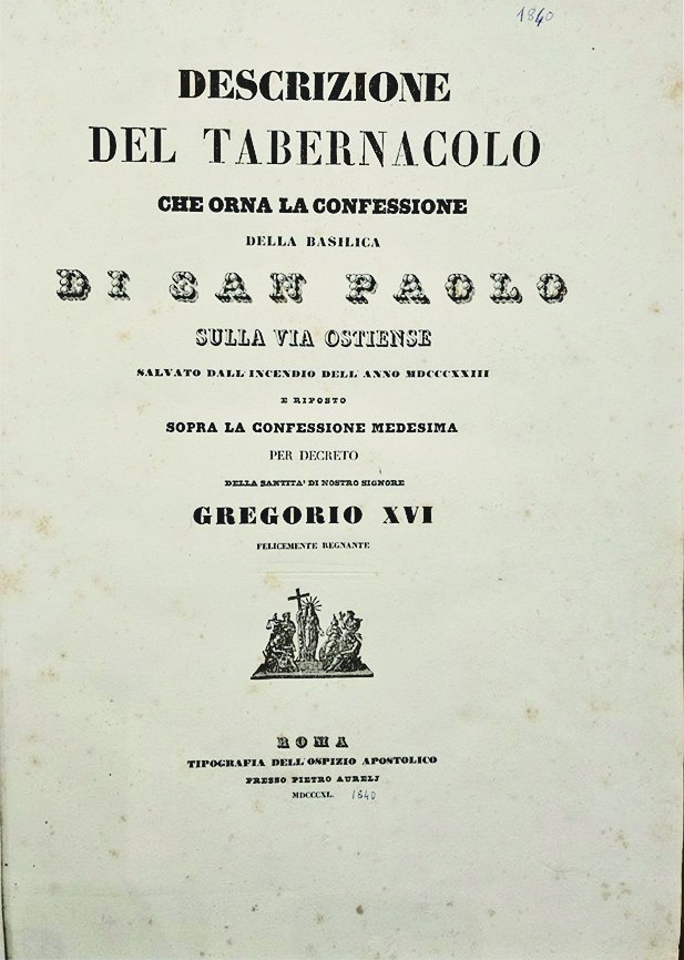 Descrizione del Tabernacolo che orna la confessione della Basilica di San Paolo sulla via Ostiense salvato dall’incendio dell’anno 1823 e riposto sopra la confessione medesima per decreto della Santità di nostro Signore Gregorio XVI felicemente regnante.
