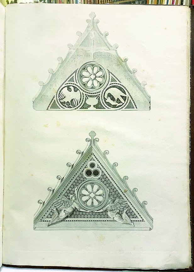 (Roma-Scultura-Fig.’800) MORESCHI Luigi. Descrizione del Tabernacolo che orna la confessione della Basilica di San Paolo sulla via Ostiense salvato dall’incendio dell’anno 1823 e riposto sopra la confessione medesima per decreto della Santità di nostro Signore Gregorio XVI felicemente regnante. Roma, Tipografia dell’Ospizio Apostolico, 1840. In-folio (38x52), bella legatura coeva in tutta pelle chiara, artistiche cornici in oro a motivi floreali ai piatti e piccoli decori dorati oro al dorso. 2 cc., 43, 23 pp., 11 tavole incise in acciaio da Filippo Trojani. (compreso il titolo); Prima edizione. Le tavole sono datate sul titolo 1838 e sono prodotte dalla Calcografia della R. C. Apostolica. Il Tabernacolo o Ciborio di San Paolo fu realizzato da Arnolfo di Cambio (1240 - 1302) nel 1285. Rossetti 7209. Olschki (Roma) 17623.