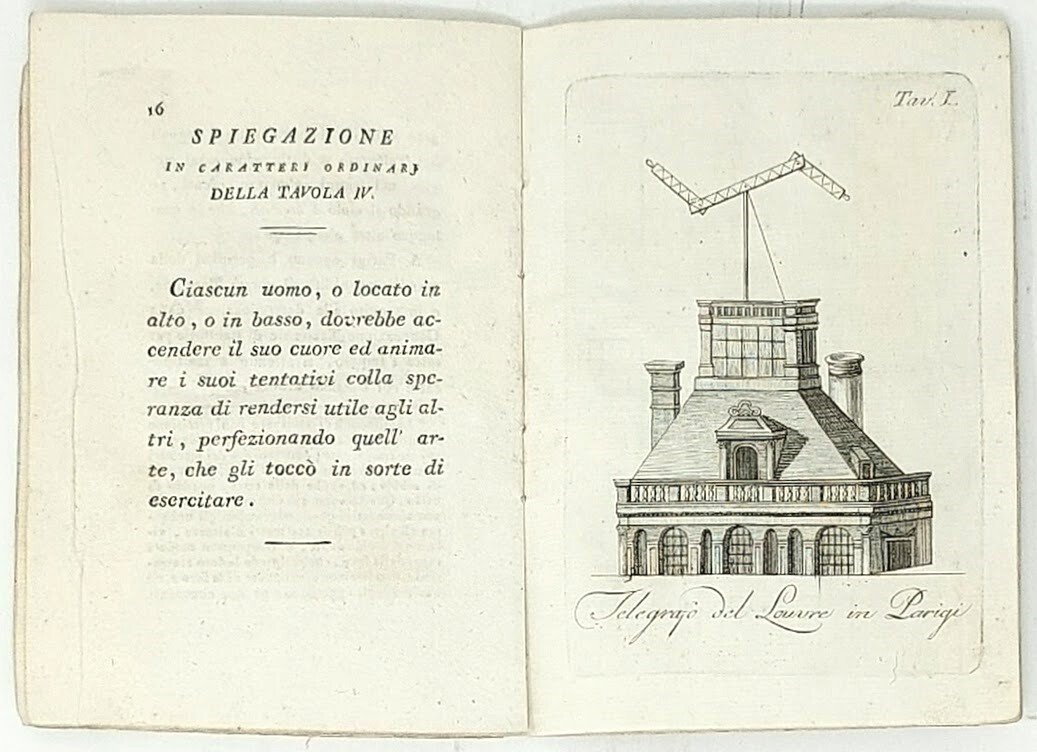 >in-8 (164x113 mm), pp. 16, brossura in carta decorata. Con 4 tavole f.t. incise in rame raffiguranti la stazione del telegrafo ad asta del Louvre, l'alfabeto morse e un testo in codice. Si tratta della traduzione italiana di un testo tedesco apparso a Leipzig nel 1794 in cui vengono descritti i progressi nella tecnica sino all'invenzione di Chappe del telegrafo ad asta, così definito in quanto su una torre era installato un braccio rotante che portava alle estremità due bracci minori. Il tutto era manovrabile per assumere configurazioni standardizzate corrispondenti a lettere, numeri e ordini di servizio. Da una postazione successiva, distante diversi chilometri, un addetto dotato di cannocchiale riceveva il messaggio e contemporaneamente lo ripeteva in modo che lo si vedesse dalla stazione successiva. La prima linea fu aperta nel 1794 tra Parigi e Lilla. Il sistema ebbe successo e nei decenni seguenti si sviluppò una rete di centinaia di tali segnalatori telegrafici. Ottimo esemplare di rarissimo opuscolo, censito in una sola Biblioteca pubblica italiana.