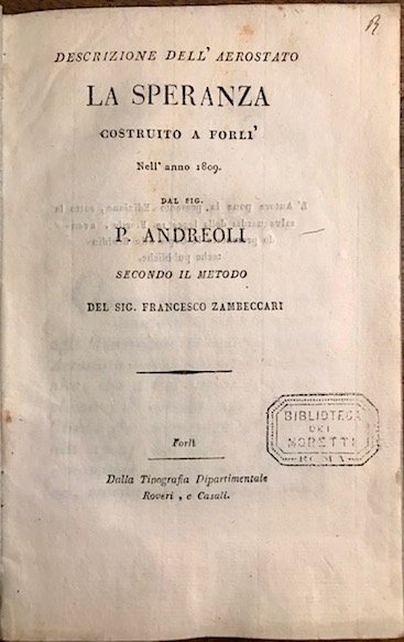 Descrizione dell’aerostato La Speranza costruito a Forlì nell’anno 1809 dal sig. P. Andreoli secondo il metodo del sig. Francesco Zambeccari
