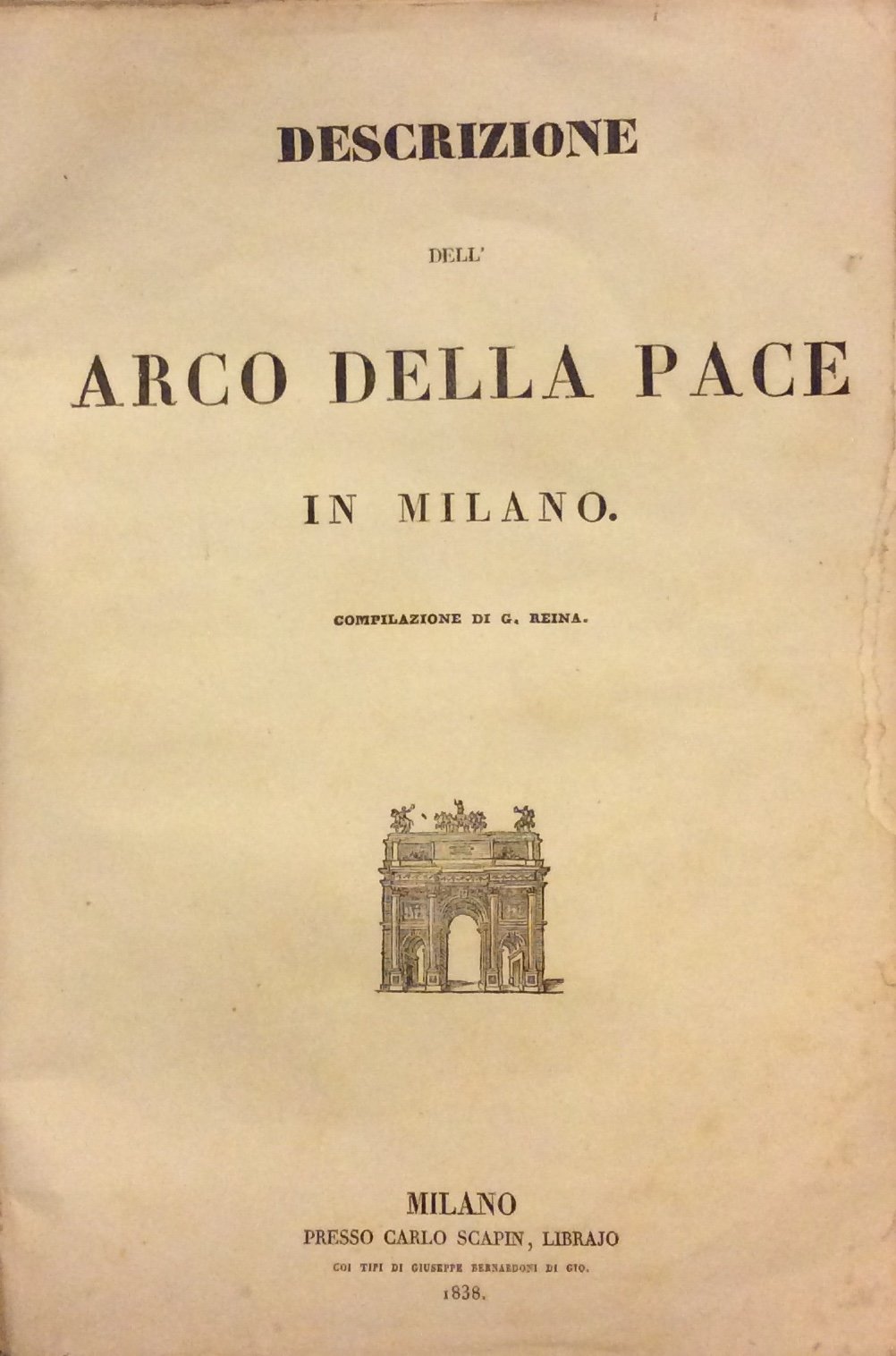 In-8 gr. (mm. 270x180), bross. muta coeva, pp. 10, con 2 tavole fuori testo a doppia pag., che raffigurano l'Arco della Pace veduto verso la città e veduto verso la campagna. "Edizione originale". Cfr. Cat. Hoepli,1339. Piccole manc. margin. ma buon esemplare.