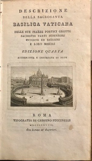 12mo (cm. 19), XI-215(1) pp. con una graziosa incisione al frontespizio (veduta di piazza S. Pietro) e due tavv. f.t. (pianta e veduta interna della Basilica). Legatura coeva in mz. pelle con fili e titolo impresso in oro al ds. (lievi tracce d’uso). Esemplare in ottimo stato di conservazione. Il nome dell’A. si ricava da L. Schudt, Le guide di Roma, n. 998. Rossetti, 1319.