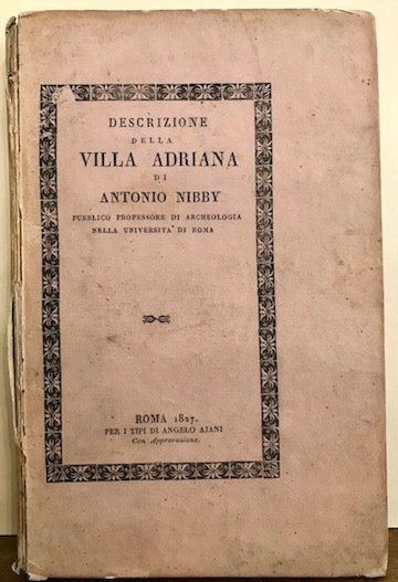 8vo (cm. 22,5), 4 cc.nn., 62 pp., 1 c.nn. Con una grande tavola f.t. più volte ripiegata (’Pianta della Villa Tiburtina di Adriano Augusto tratta da quella di Fr. Piranesi’). Cartonato editoriale (fenditure alle cerniere, ma legatura ben solida). Ex libris di collezione privata al contropiatto anteriore. Ottimo esemplare.
