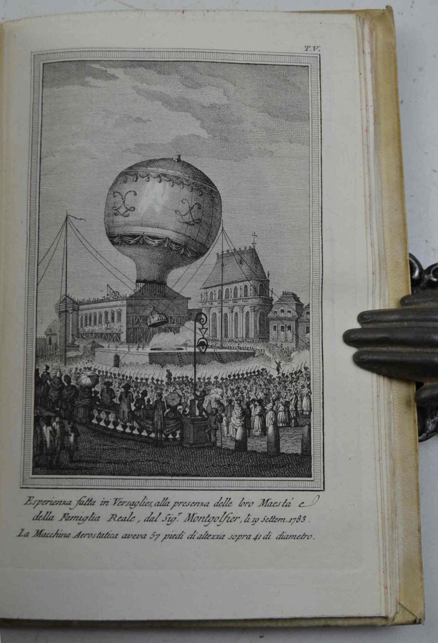 Cm. 21, pp. xxxii, 320. Con 9 tavole f.t. incise in rame seguite da 5 tabelle di osservazioni (di cui una ripiegata). Solida legatura strettamente coeva in piena pergamena rigida con titoli in oro su tassello al dorso. PRIVO DELL'ANTIPORTA. Peraltro esemplare particolarmente fresco e marginoso, in ottimo stato di conservazione. Edizione originale della traduzione italiana condotta sull'edizione apparsa in Francia l'anno precedente. Nessuna copia censita menziona le tabelle (di interesse aerostatico) che si trovano in fondo al presente volume.