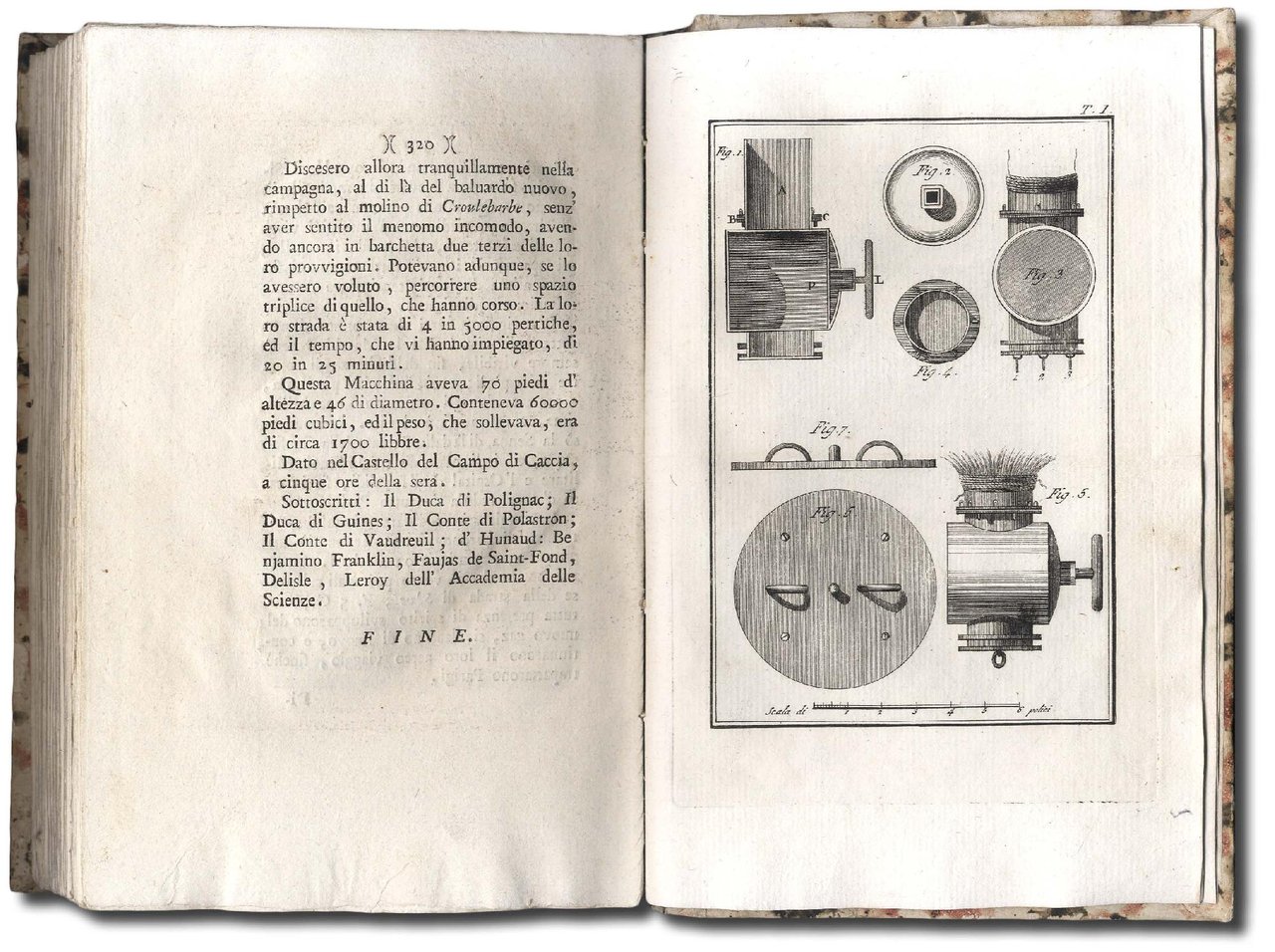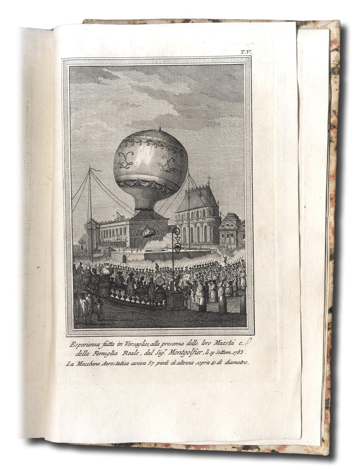 >in-8 (mm 225x 145), pp. XXXII, 320, con antiporta e 9 tav.incise in rame fuori testo. Bella legatura in cartonato coevo marmorizzato, tit. ms. su tassello al dorso. Antiporta inciso raffigurante entro medaglione il ritratto dei due fratelli Stefano e Giuseppe Montgolfier. Prima edizione italiana, molto rara, pubblicata dopo l'originale di Parigi dell'anno precedente. Importante relazione della prima ascensione pubblica di un pallone aerostatico avvenuta il 4 giugno 1783 a Vivarais grazie alle invenzioni del fratelli Montgolfier. Faujas de S.Fond assistette all'avvenimento e ne ricavò la presente narrazione. Esemplare assai bello, fresco e a pieni margini. Caproni-Boffito p.109. Morazzoni, Fig. Veneziani, p. 229.