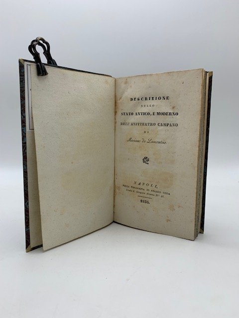 In 8 (cm 12,5 x 20,5), pp. 254 con 2 tavole finali ripiegate incise all'acquaforte. Legatura coeva in mezza pelle. Edizione originale di questo saggio storico sull'Anfiteatro campano o Anfiteatro capuano, anfiteatro di epoca romana nella citta' di Santa Maria Capua Vetere con un capitolo dedicato agli spettacoli gladiatori che si svolgevano al suo interno e al decadimento degli spettacoli, e notizie sull'anfiteatro di Pozzuoli e di Pompei.