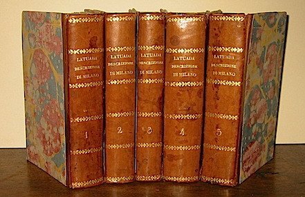 8vo (cm. 16,8), 5 Voll., 14 cc.nn., L-336 pp., con antiporta fig. e 9 tavv. rip. f.t. (compresa una grande pianta topografica della città di Milano); XX-348 pp. con 10 tavv. rip. f.t.; XII-338 pp. con 7 tavv. rip. f.t.; XVI-459 pp. con 9 tavv. rip. f.t.; XVI-448 pp. con 12 tavv. rip. f.t. Legature coeve in mz. pelle con fili e titolo in oro al ds. Tagli gialli. Piatti in carta marmorizzata. Ai contropiatti etichette cartacee della biblioteca del Marchese Solari. Eccellente esemplare, assai fresco e completo di tutte le tavole. Le belle incisioni calcografiche sono opera di Johann Georg Schiller da disegni di Ferroni. Cicognara, 4242; Fossati-Bellani II, 1938; Platneriana, p. 205.