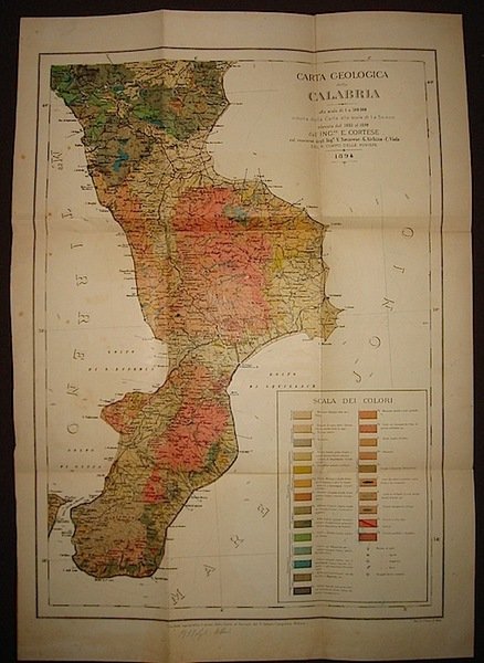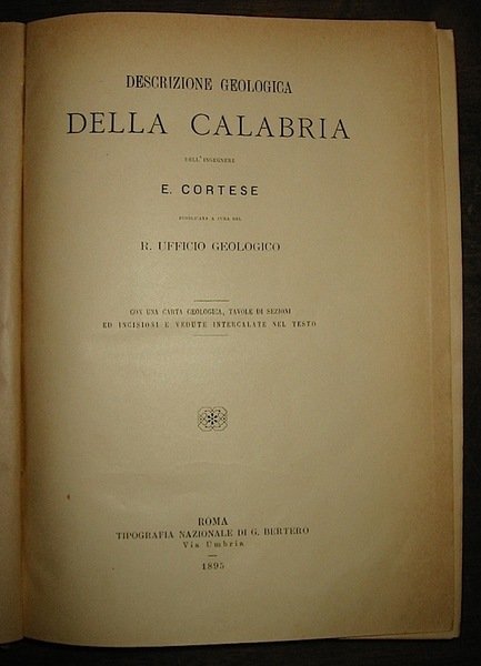 8vo (cm. 24,5), XXVIII- 310(2) pp. con ill.ni n.t., 5 vedute su tavv f.t. ed altre 4 tavv. a colori più volte rip. Inoltre grande carta geologica a colori della Calabria in busta allegata. Legatura coeva in piena tela con fili e titolo impresso in oro al ds. Ottimo esemplare. Volume IX delle ‘Memorie descrittive della carta geologica d’Italia’.