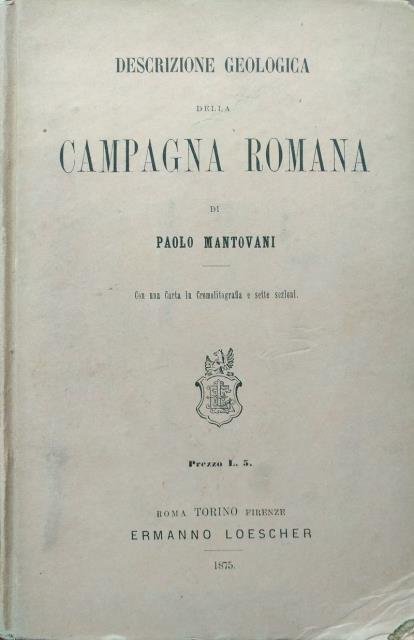 Ermanno Loescher, Roma, Torino, Firenze, 1875. In 8vo, pp. 114 + 1 (di Indice) + in fine 3 tavv. lit. in b/n che riportano 7 sezioni + 1 in cromolitografia "Carta Geologica della Campagna Romana", leg. edit. in cartone rosa. Originale e rara edizione di questo studio geologico, in cui l'Autore eseguì accurati studi sul suolo romano, raccogliendo un gran numero di materiali ed elaborando accurate osservazioni. Il Mantovani operava al di fuori del circolo scientifico accademico e a causa di alcuni errori interpretativi, il suo lavoro venne considerato di importanza minore e quindi passò in secondo piano nelle ricostruzioni storiche della geologia romana. Ma di fatto, nonostante quel primo momento, i risultati delle sue ricerche hanno assai contrinuito al progresso della geologia italiana. Ex Libris Giovanni Castellana. Usuali segni del tempo, molto bella la carta in colore arricchita da spiegazioni corsive a lato, buono lo stato di conservazione.
