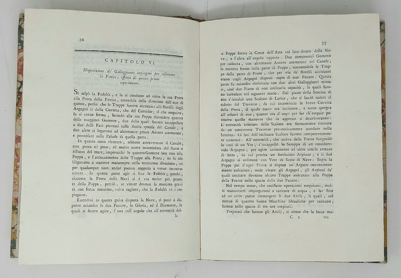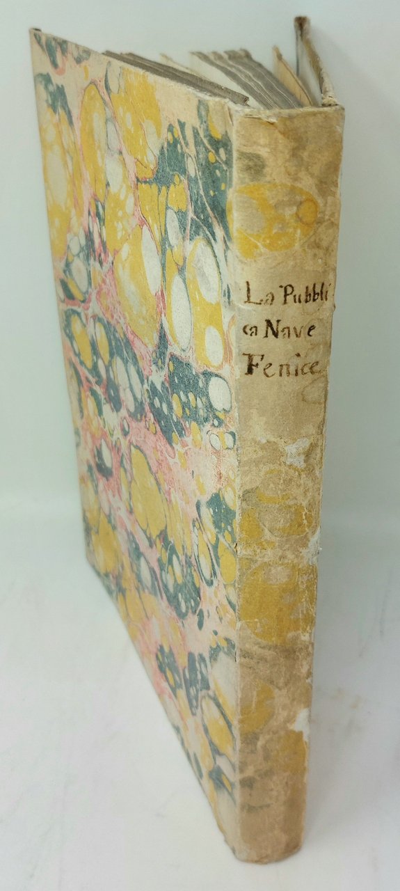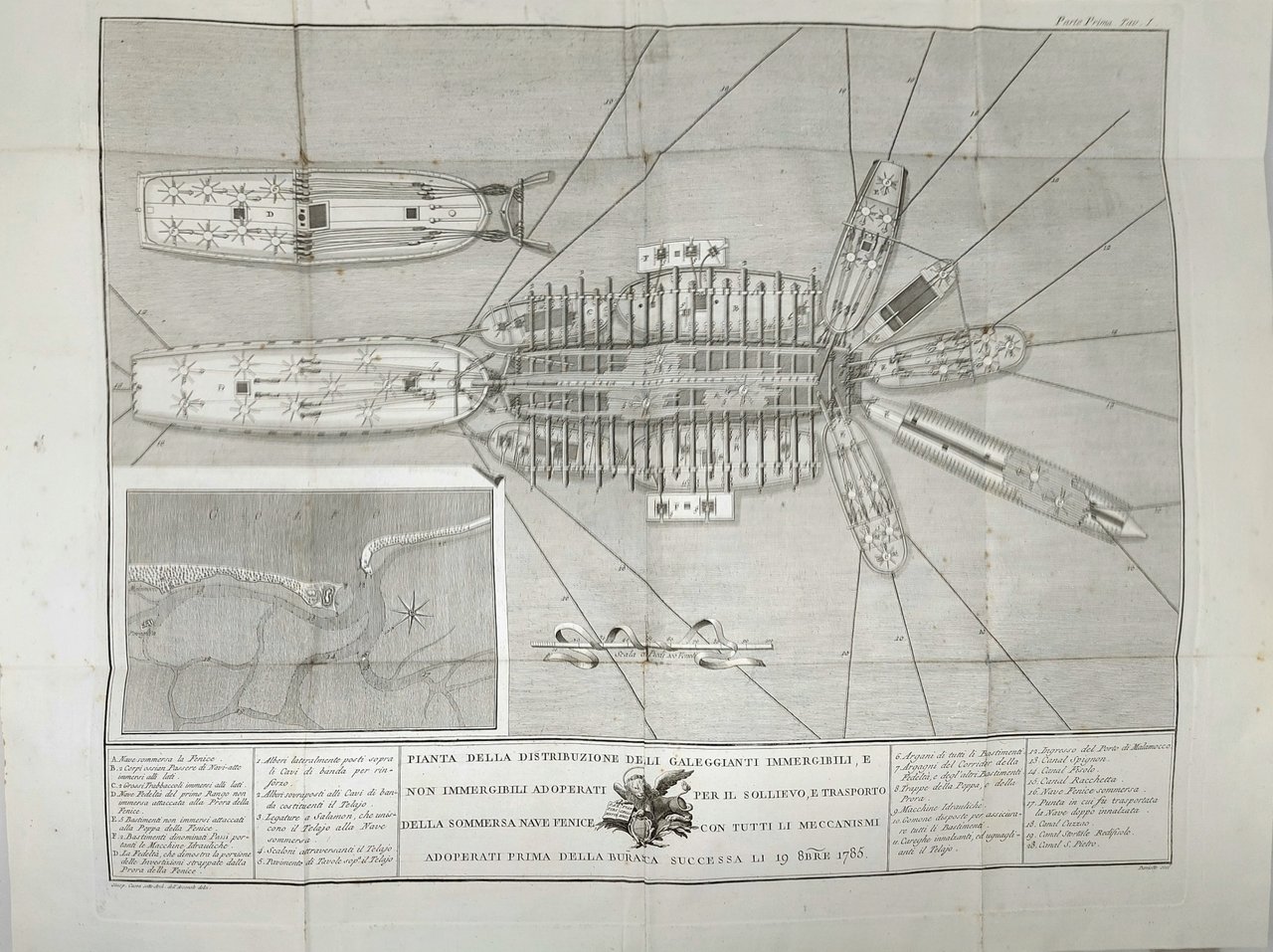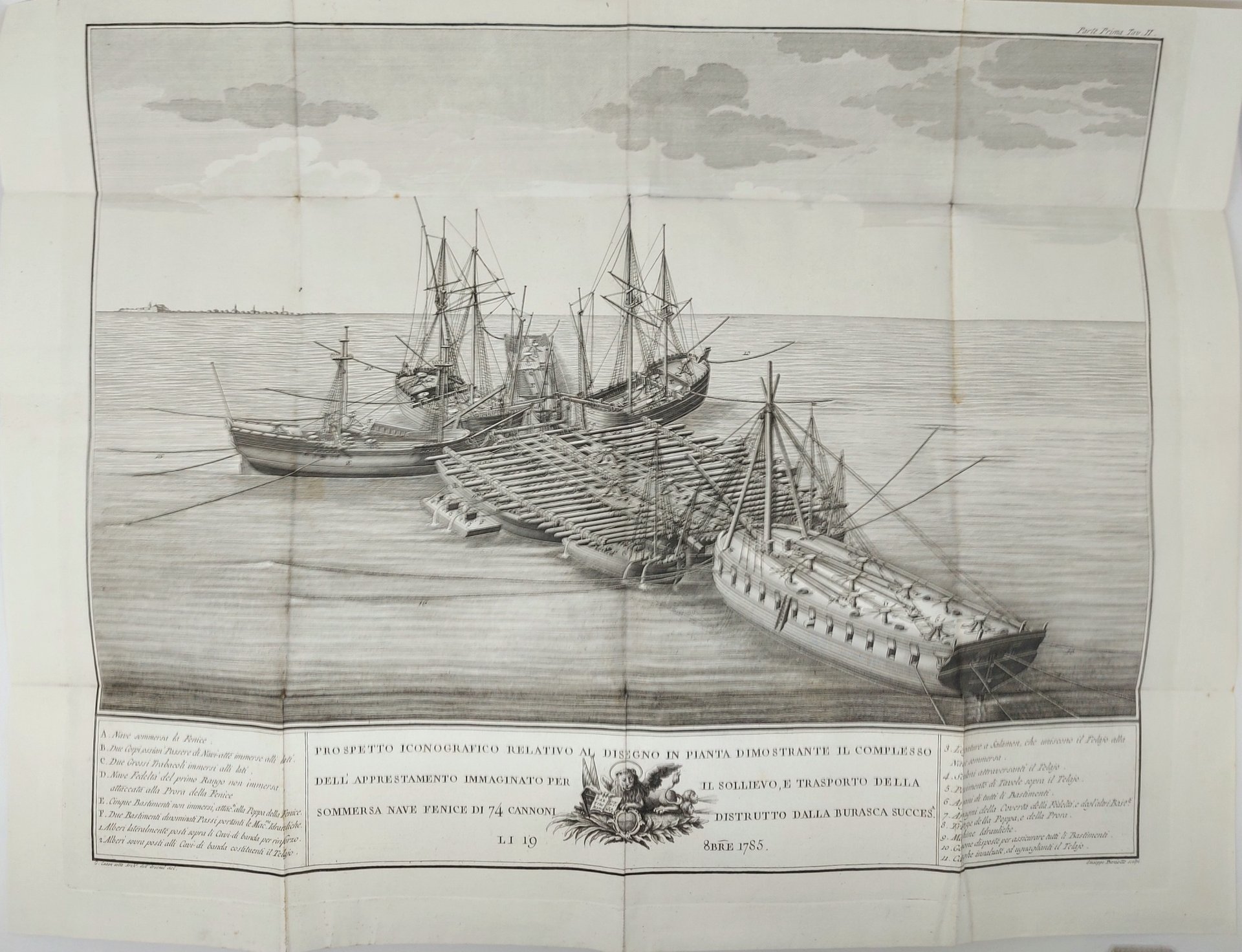 >in-4 (270x200 mm), pp. XXXII (le prime due bianche), 90, (2). Leg. coeva cart. marmorizz., tit. ms. al dorso. Con antiporta allegorico e 7 interessantissime grandi tavole più volte ripieg. f.t. (mm 475 x 590), disegnate da Gius. Cason e finem. incise in rame da Gius. Daniotto; esse raffigurano in maniera nitida e dettagliata la nave ed i vari apparati tecnici impiegati per recuperarla. L'opera espone i vani tentativi precedentemente fatti, i nuovi modelli e metodi impiegati, le verifiche e le decisioni della commissione incaricata di portare alla luce la nave da guerra veneziana di settantaquattro cannoni, detta la Fenice, che giaceva sul fondo della laguna. Prima ed unica edizione di ''opera importantissima per gli studiosi della meccanica applicata alla nautica'' (Riccardi). Magnifico esemplare. Riccardi I, 407. Cicogna 1458. Morazzoni 263.