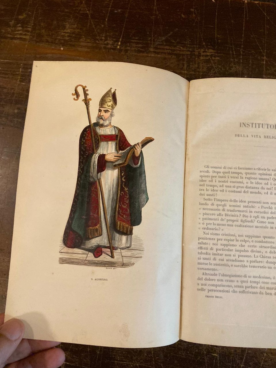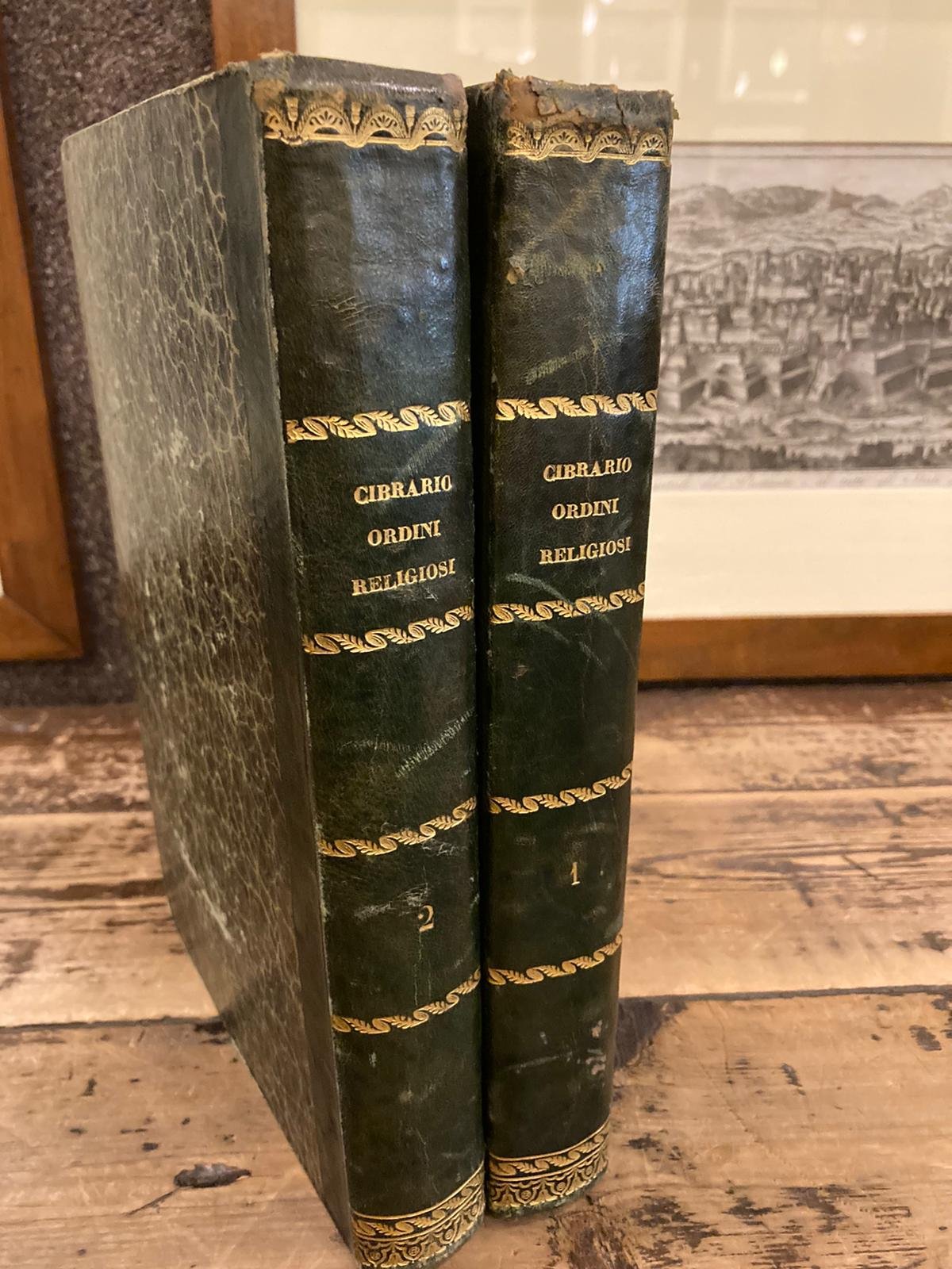 2 volumi in-4° (266x175mm), pp. (4), 345, (3); 446, (2); legatura coeva m. pelle verde con titolo, fregi e tomaisons dorate ai dorsi. Piatti marmorizzati cailloutés. Punte in pergamena. 97 tavv. in xilografia a colori f.t. (68 + 28) con raffigurazioni dei principali ordini religiosi della cristianità. Ex-libris ottocentesco del canonico Epifanio Molli da Borgomanero. Ottimo esemplare. Prima edizione. Per la compilazione della presente opera il Cibrario si avvalse di numerose opere precedenti, fra cui quelle menzionate nel frontespizio. La collazione iconografica degli esemplari dell'opera non è mai univoca, in quanto il numero delle tavole varia sempre; l'indice iconografico del secondo vol. registra 5 altre tavv. qui non presenti, ma tale anomalia si riscontra pressoché nella totalità delle copie. Colas, n. 621. Lipperheide, 1882. Vinet, 2159.