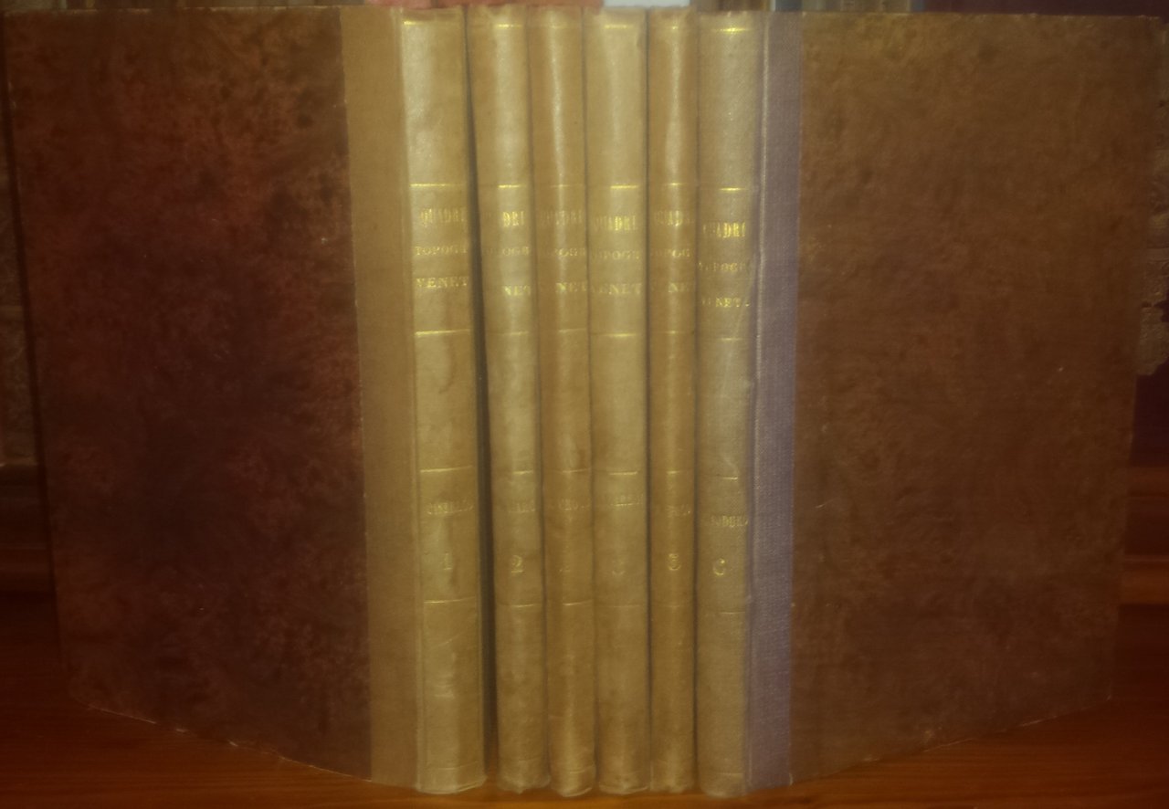 In-4 (25 cm) 6 voll. (31) c. (tavole numerate I-XXX) 84 (1). La Giudecca (XXX) ha due carte perchè divisa in due parti. Mezza tela, piatti rivestiti di carta marmorizzata. Gora alle prime pagine del primo volume. Pagine di testo arrossate, ma tavole perfettamente chiare e pulite. Gino N 219: l'opera (di Paganuzzi) fu riedita priva della pianta topografica dell'editore Cecchini Le tavole sono prese dall'opera del Paganuzzi (Iconografia. Venezia: 1821) senza aggiornare le modificazioni avvenute tra il 1821 e il 1844; a quest'opera aggiunse però una descrizione storico-artistica dei luoghi sacri e profani della città. (Giovanni Battista Contarini. Menzioni onorifiche dei defunti, ossia, Raccolta di elogi, biografie, lapidi . p. 31.). Al contrario Cicogna (N4533) sostiente le tavole "abbiano subito qualche cambiamento per adattarle possibilmente ai posteriori avvenuti cambiamenti". Bibliografia italiana: ossia elenco generale delle opere d'ogni specie N 256.
