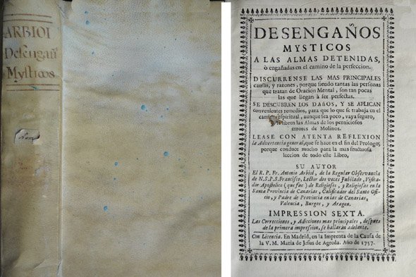 Desengaños Mysticos a las almas detenidas, ó engañadas, en el Camino de la Perfección. Discurrense las mas principales causas y razones porque siendo tantas las personas que tratan de Oracion Mental, son tan pocas las que llegan a ser perfectas. Se descubren los daños y se aplican convenientes remedios para que lo que se trabaja en el camino espiritual, aunque sea poco, vaya seguro y se libren las Almas de los perniciosos errores de Molinos. | Libri antichi e moderni | Arbiol, Fray Antonio [1651-1726].