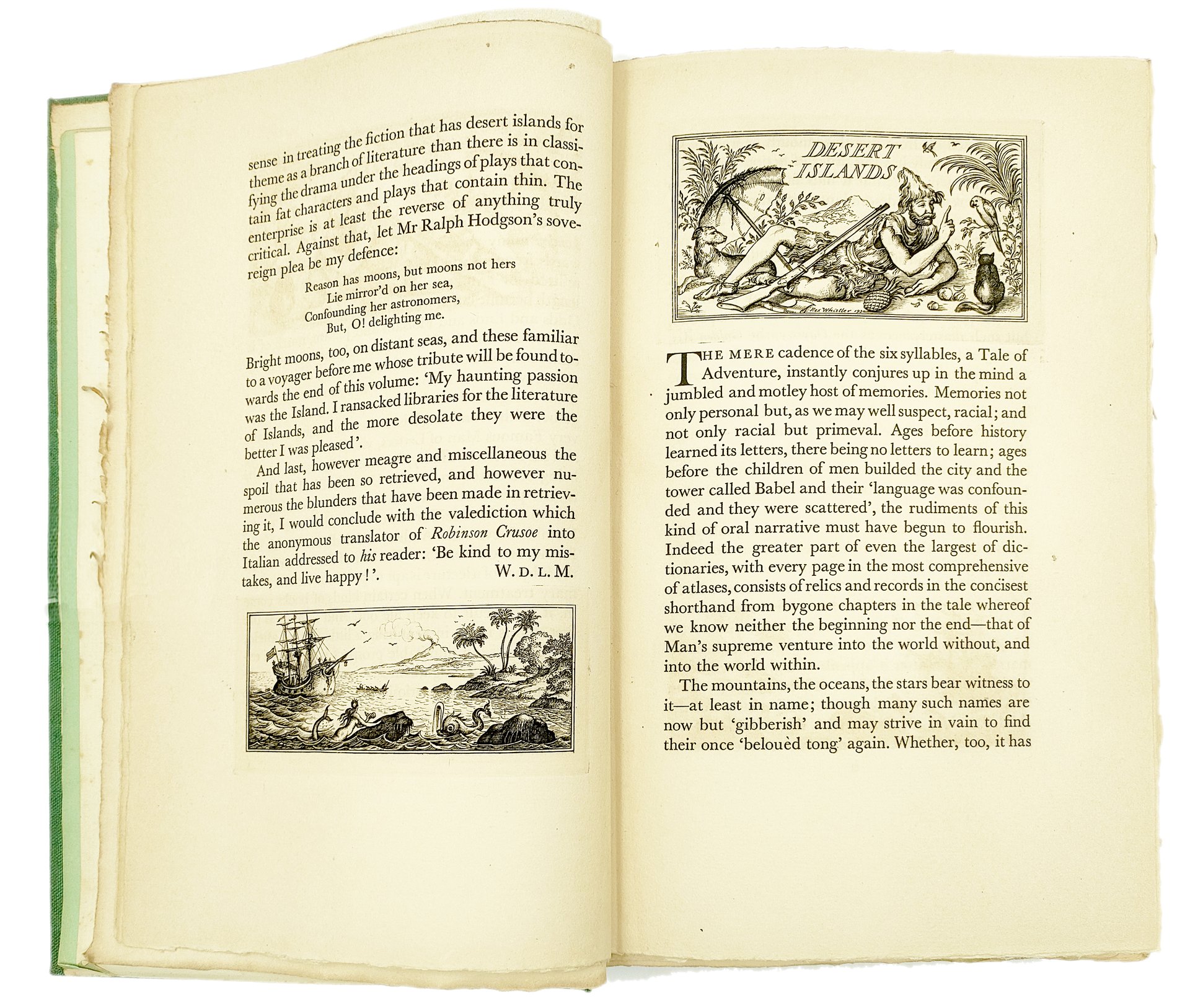 In 8vo (260x160 mm). Pagine [6], 285, [3] + 1 antiporta e 4 vignette nel testo incise in rame da Rex Whistler. Ottima copia in barbe. Esemplare n. 639/650, firmato dall’Autore nella pagina del giustificativo e su pecetta applicata dell’illustratore. Legatura editoriale in piena tela verde con titoli e decori impressi in oro al dorso e piccolo illustrazione dorata al piatto anteriore.