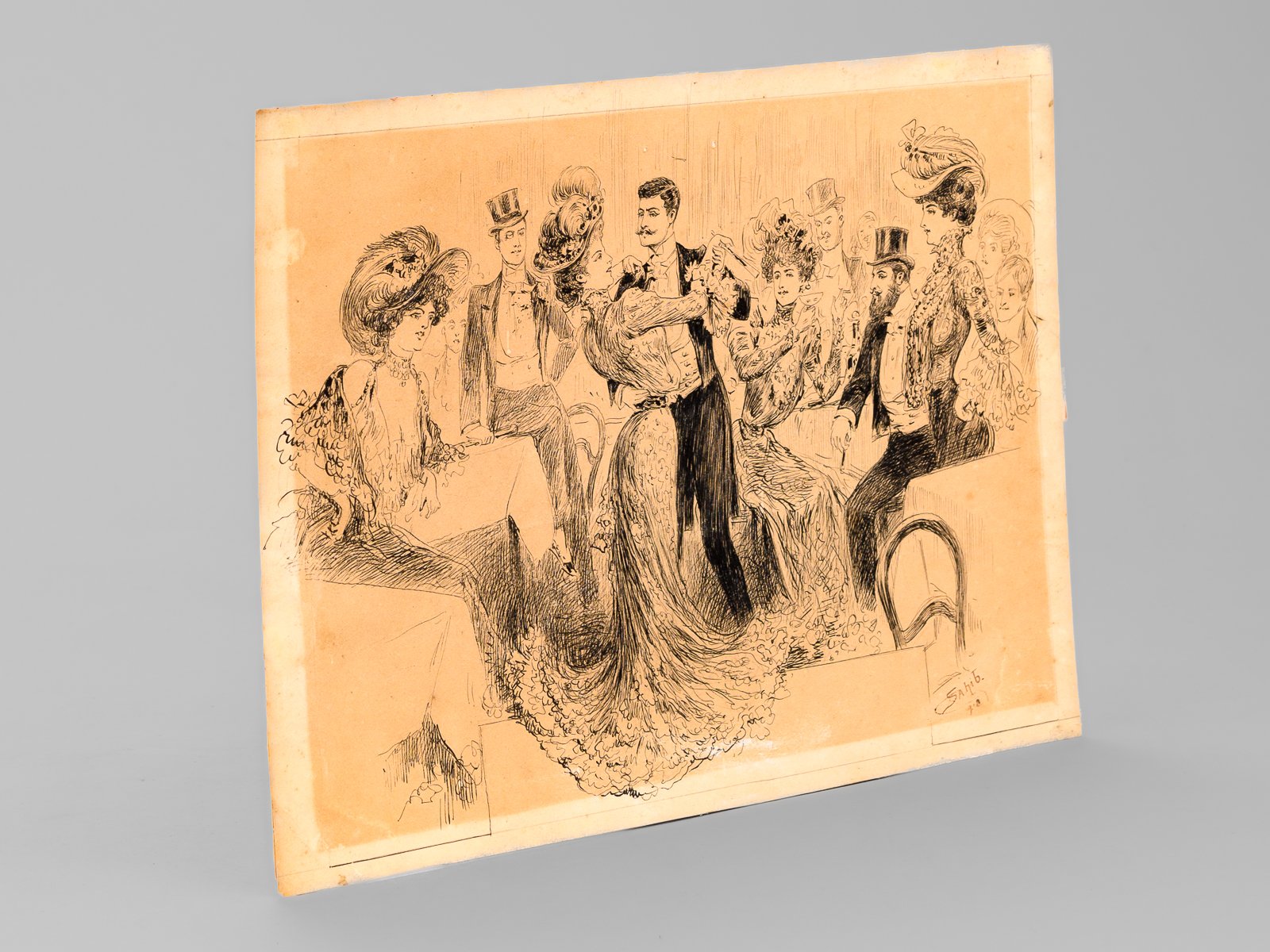 [ Dessin original à la plume signé par Sahib : Couple dansant dans une soirée habillée, messieurs en smoking et dames en belles toilettes ]