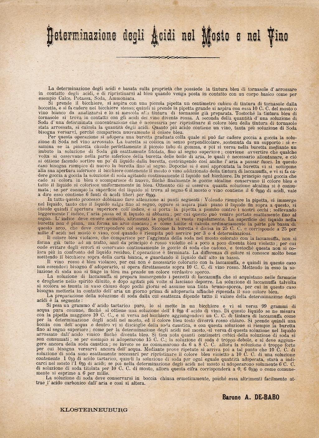 Analisi enologiche. Argomento: Agricoltura. Autore: De Baro A. Barone. Editore: n.d. Luogo: Klosterneuburg. Anno: 1900 ca. Formato: in-8°. Pagg: 1. Legatura: foglio sciolto. Conservazione: buona.