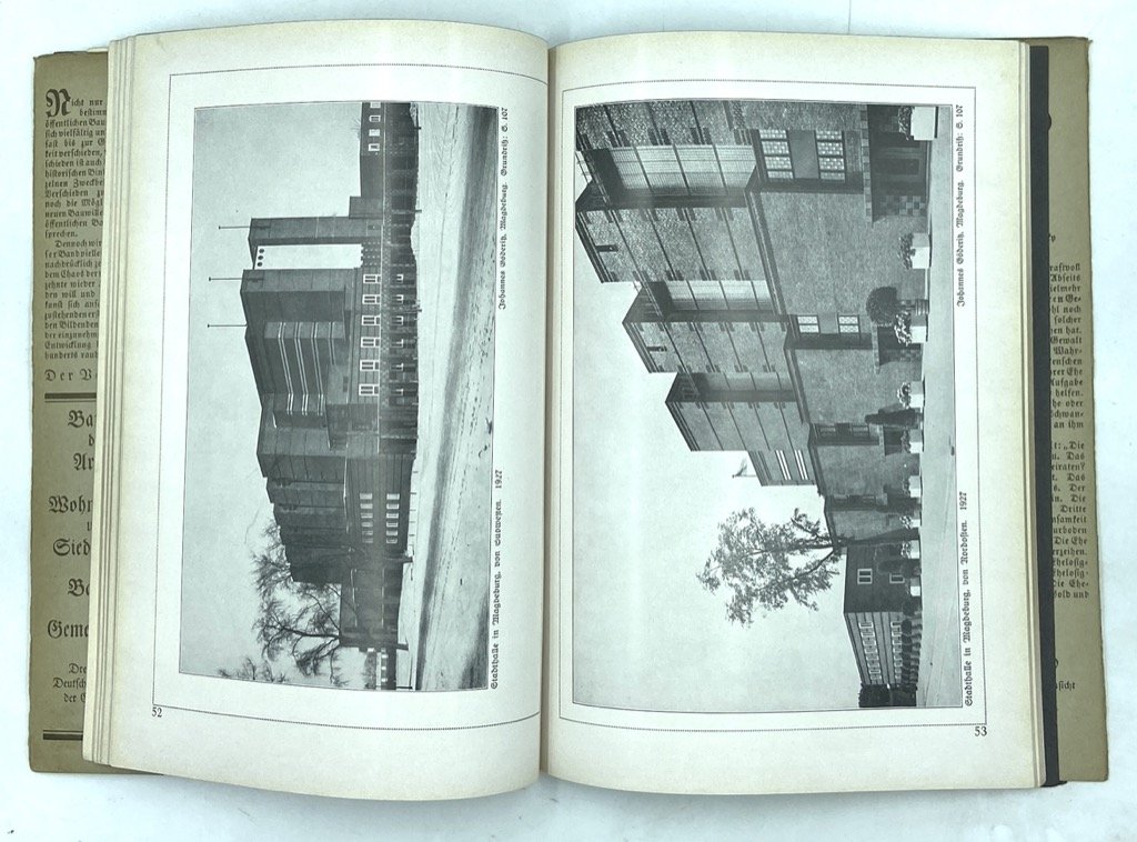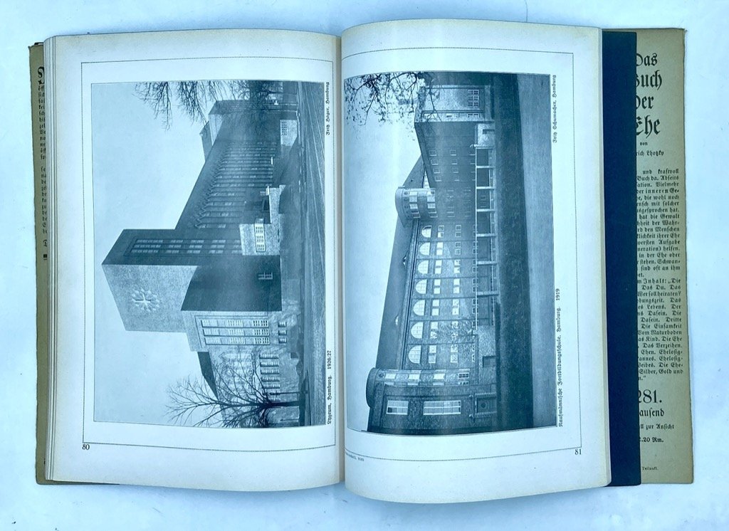 Brossura editoriale decorata con sovraccoperta illustrata, cm 26.5 x 19, pp 110 (2) illustrate in nero. Testo in tedesco. Bella monografia dedicata all’architettura degli edifici pubblici in Germania nel primo terzo del Secolo XX, con fotografie e alcune planimetrie di edifici scolastici e collegi, municipi, sale pubbliche, teatri, chiese ecc. Il volume fa parte della fortunata collana di divulgazione artistica «Die Blauen Bücher» pubblicata da Langewiesche dal 1907; la raffinata veste grafica fu progettata da Karl Köster. Presentati progetti di Walter Gropius (Bauhaus Dessau, fotografie di Lucia Moholy), Henry van de Velde, Josef Ulrich, Peter Behrens, Otto Bartning, Joseph Maria Olbrich, Max Taut e altri. Conserva la piccola scheda pubblicitaria dell’editore.