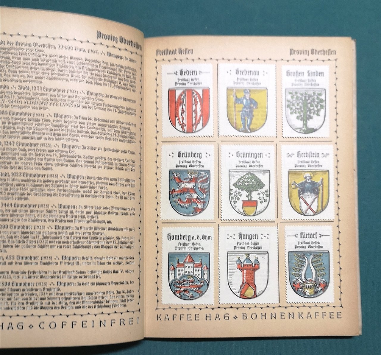 >in-8, 35 tavole in cartoncino, di cui 30 recano al recto 9 stemmi locali a colori applicati e 5 figurate al recto con grande stemma araldico della regione, testo al verso. Cartonato edit. figurato a colori, legatura a chiodi, astuccio in cartone rustico muto. Raccolta di 270 piccoli stemmi araldici cittadini a colori, con breve descrizione, le cifre della popolazione sono basate sull'anno 1925. Ottimo esemplare.