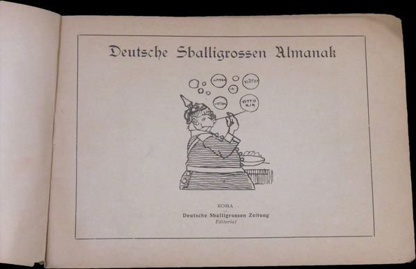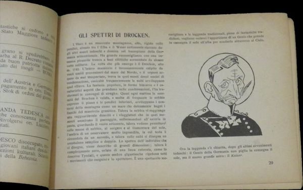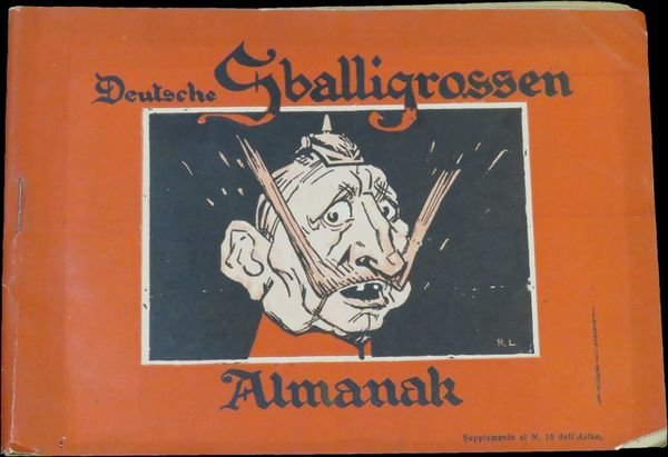 In oblungo (17,8×12 cm); 62, (2) pp. Brossura editoriale illustrata. Prima edizione di questo rarissimo supplemento satirico della celeberrima rivista "L'Asino". Testo in italiano con numerosissime illustrazioni del celebre editore, cofondatore del giornale "L'Asino" (insieme Guido Poderecca), Gabriele Galantara che raggiunge in quest'opera una dei vertici della sua arte. Di profonde convinzioni socialiste. "Nel 1911 la guerra italo-turca fu la causa di un grave dissidio con Podrecca, che nel 1909 era stato eletto deputato nelle liste del PSI e si era schierato a favore dell'impresa coloniale, mentre Galantara espresse posizioni anticolonialiste. Il giornale riuscì a dare spazio a entrambe le posizioni, ma senza dubbio le grandi vignette a colori contro la guerra risultavano più efficaci degli articoli di Podrecca, che nel 1912 venne espulso dal Partito Socialista Italiano, assieme al fondatoredell'Avanti! Leonida Bissolati e ad Ivanoe Bonomi. Gabriele Galantara, "Il grido di domani: Abbasso la guerra!", copertina de L'Asino del 9 agosto 1914, basata sul concetto: "questa è l'ultima guerra". Nonostante l'intento della vignetta fosse pro-intervento, essa è divenuta nel tempo un'immagine pacifista ed antimilitarista. I contrasti tra i due furono in parte superati quando, alla v igilia della prima guerra mondiale, entrambi si ritrovarono d'accordo sulla linea interventista espressa da Bissolati. Il cambiamento di rotta di Galantara trovava una spiegazione nella simpatia che egli nutriva per la Francia democratica e nell'avversione nei confronti degli Imperi centrali, e in particolare dell'Austria, considerati i baluardi della reazione e del clericalismo. E perciò, pur avendo rotto con il Partito socialista, Galantara continuò a rivendicare la propria coerenza con i principî socialisti. Gabriele Galantara, copertina antiaustriaca de L'Asino del 6 giugno 1915. Diede il suo apporto alla causa interventista e alla propaganda di guerra con le caricature, divenute famose, di "Guglielmone" e di "Cecco Beppe" e predicando l'ostilità verso la "barbarie teutonica". Le sue vignette vennero ripubblicate su altri giornali dei paesi dell'Intesa e furono esposte nel luglio 1916 alle "Leicester Galleries" di Londra, mentre altre vignette apparvero sul periodico parigino "L'Europe antiprussienne" e sul giornale di trincea "Signor sì".". Prima rarissima edizione di questo libro incentrato sulla satira delle posizioni e della propaganda tedesca durante il 1916. Buono stato di conservazione, molto raro.