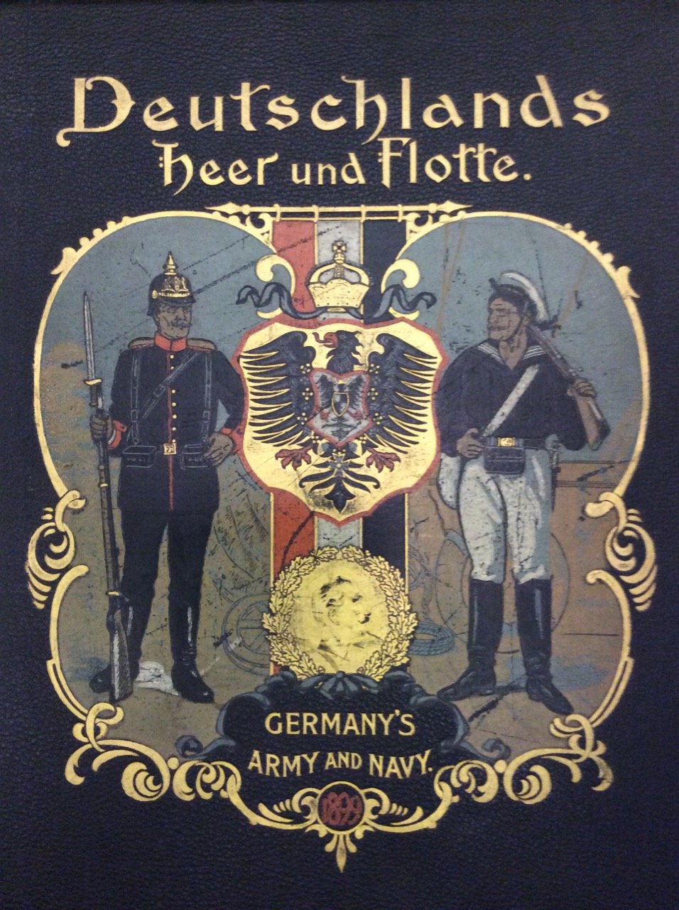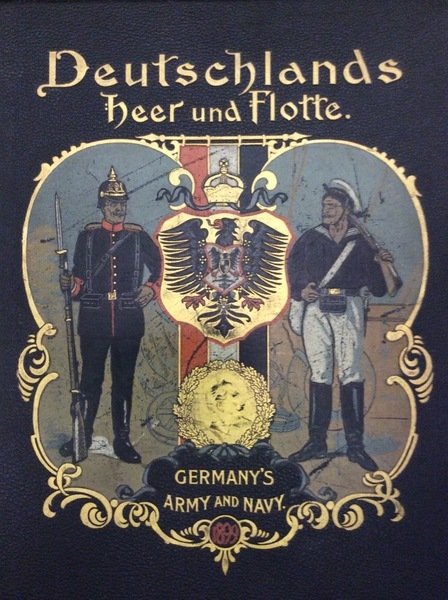 In folio (mm. 450x335), pregevole legatura editoriale in pelle blu con una ricca decorazione figurata a colori e oro al piatto anteriore, tagli dorati, pp. (6),181, illustrata fuori testo da 41 affascinanti tavole in cromolitografia, protette da velina con didascalia, che raffigurano l'armata tedesca nelle sue bellissime uniformi dell'esercito e della marina e con la flotta navale, da dipinti dell'artista tedesco Georg Arnould. Testo su due colonne in tedesco e inglese. " Prima edizione"Cfr. Benezit,I, p. 464.Esemplare molto ben conservato.