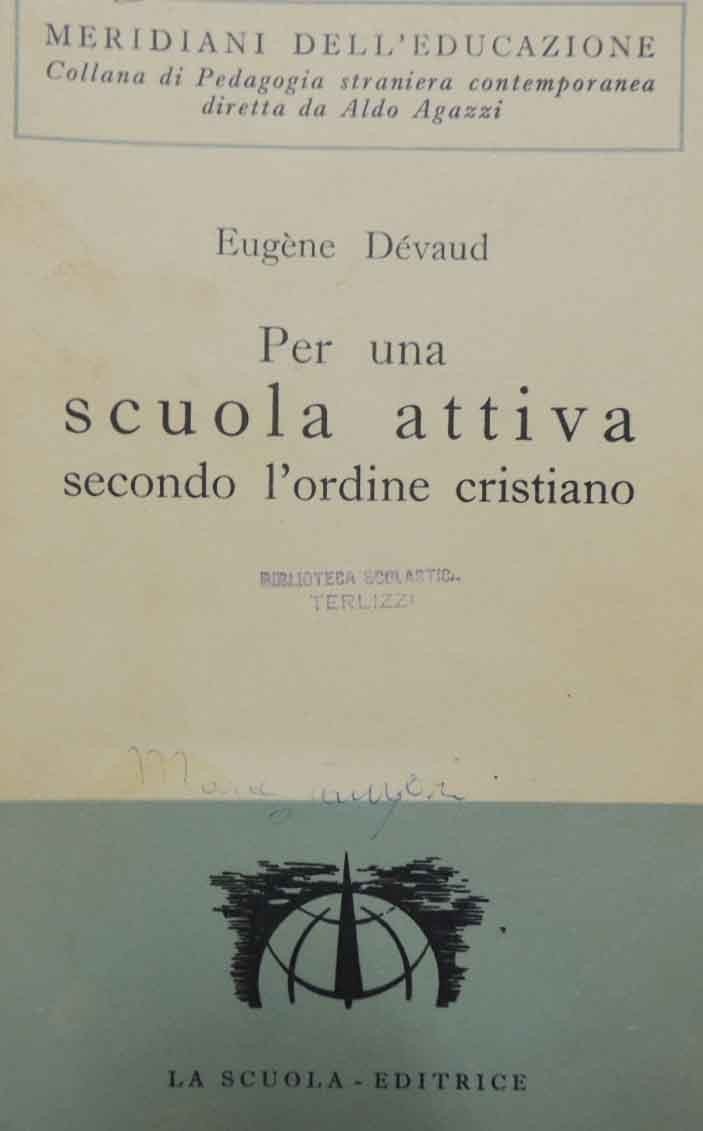 Eugène Dévaud, Per una scuola attiva secondo l’ordine cristiano, a cura di Aldo Agazzi, La Scuola Editrice, Brescia 1955, pp. 200, cm 21, br. ed. Collana Meridiani dell’Educazione. Titoli originali. Pour une école active selon l’ordre chréten – Le système decroly et la pédagogie chrétienne. Al dorso, piccola etichetta adesiva con numero progressivo di classificazione. Due firme di appartenenza alla prima di copertina, numero progressivo di classificazione segnato a biro su prima di copertina e occhiello, piccolo timbro di estinta biblioteca scolastica a prima di copertina, frontespizio e su alcune carte interne, per il resto leggere tracce d’uso, alcune sottolineature a lapis, minime fioriture, lieve brunitura della carta, ma nel complesso buona copia.