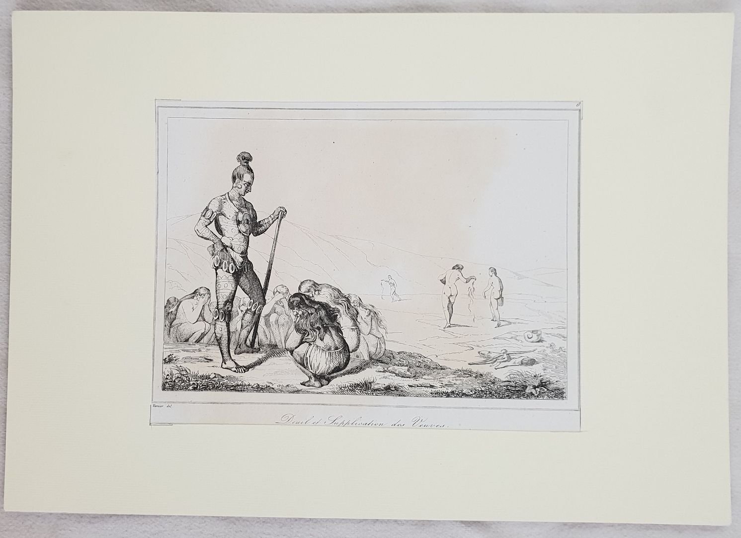 Veduta animata del 1838 circa che mostra vedove indiane native montata in passepartout. Autore: Vernier Data: 1838 circa Tecnica: acquaforte Dimensione foglio: 17,5x25 cm Dimensione incisione: 11,5x15 cm Condizioni: Buone. Rare fioriture.Nice view of indian widows of 1838 circa mounted in a passepartout. Author: Vernier Date: 1838 circa Technique: Steel etching Passepartout Dimension: 17,5x25 cm (6.9x9.8 inches) Engraving Dimension: 11,5x15 cm (4.7x5.9 inches) Conditions: Good conditions. Some foxings and water stains.