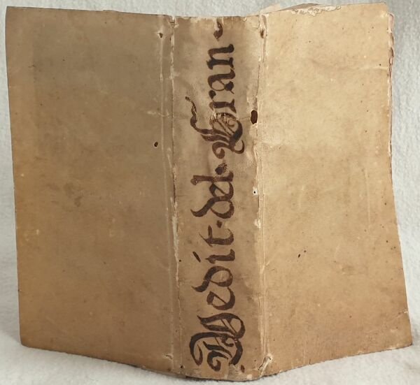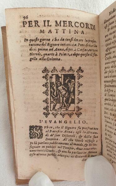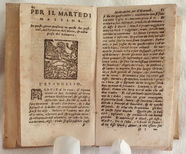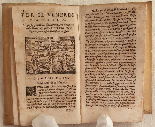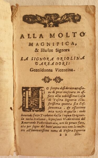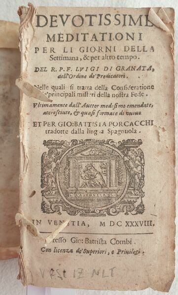 Rarissima edizione illustrata del 1638 di questa raccolta di opere del teologo spagnolo Luis de la Granada (1504-1588). All'interno "Dell'oratione e meditatione" del Padre Luigi Granata illustrato con otto xilografie a mezza pagina di scene evangeliche tra cui la crocifissione ecc. Traduzione dallo spagnolo a cura di Giovanni Battista Porcacchi. Tra gli argomenti trattati: Contemplazione della croce, peccati, Paura della morte, estrema unzione, fine del mondo, Profonda orazione ecc. In buone condizioni. Copertina in piena pergamena coeva con titolo manoscritto al dorso in buone condizioni generali con lievi usure ai margini e dorso. Legatura in mediocri condizioni con rotture ma corpo del libro staccato dalla copertina. Pagine in buone condizioni con rare fioriture. Piccolo segno di tarlo alle prime 4 carte. In 16. Dim. 14x7,5 cm. Pp. (24)+474+(2). Very scarce illustrated edition of 1638 of this collection of works by the spanish theologist Luis de la Granada (1504-1588). Inside "Dell'oratione e meditatione" by the Father Luigi Granata illustarted with half page eight woodcuts of gospel scenes between them crossfition ecc. Translation from spanish language by Giovanni Battista Porcacchi. The issues treated: §Cotnemplation of the cross, sins, Fear of death, extreme unction, end of the world, Deep oration etc. In good conditions. Full parhcment coeval cover with handwritten title in the spine in good general conditions lightly worn in the extremities. Binding in poor conditions with cracks but the body of the book detached from the cover. Inside pages are in good conditions with occasional foxing. Little worming in the first 4 pages. In 16. Dim. 14x7,5 cm. Pp. (24)+474+(2).