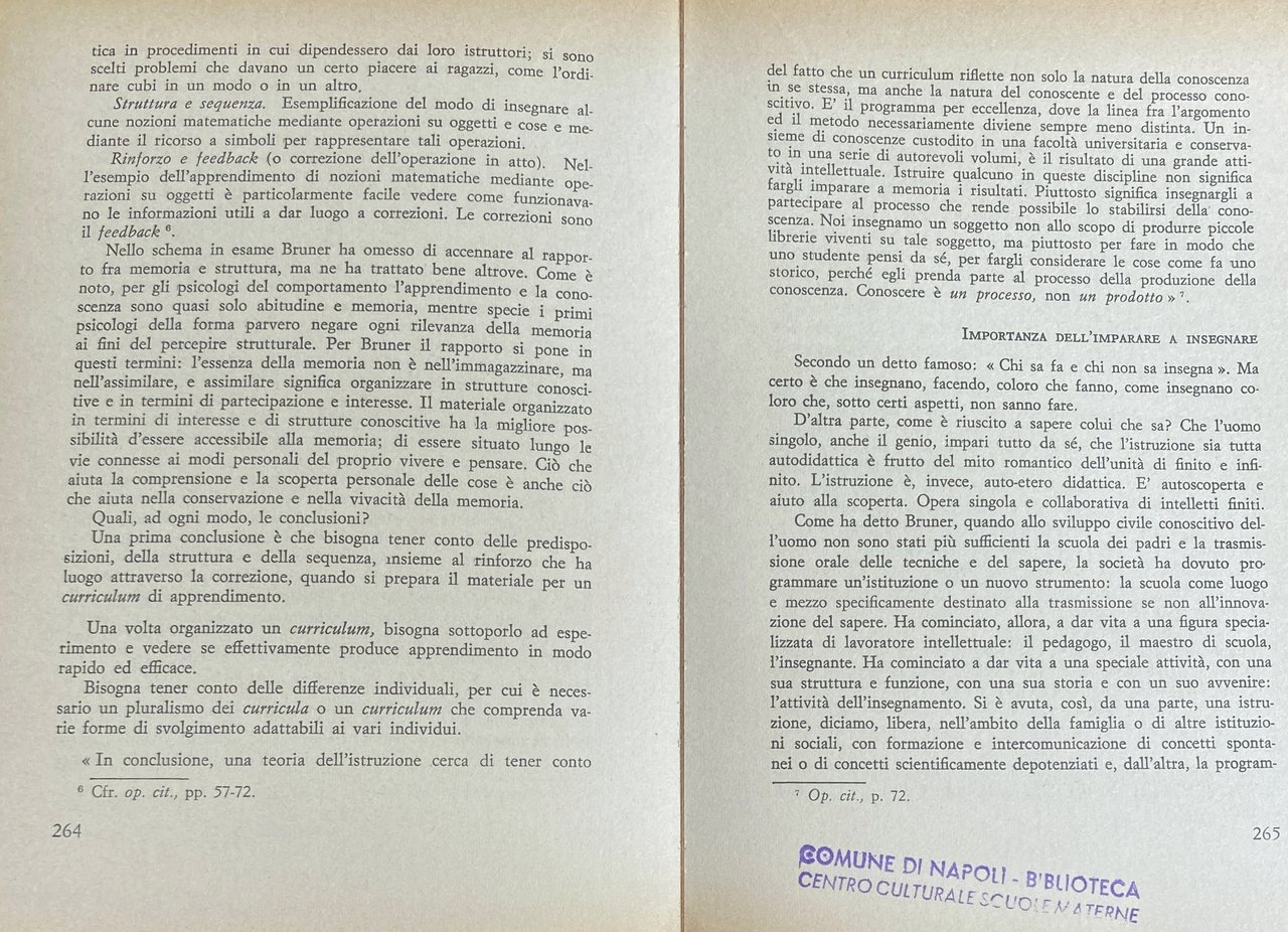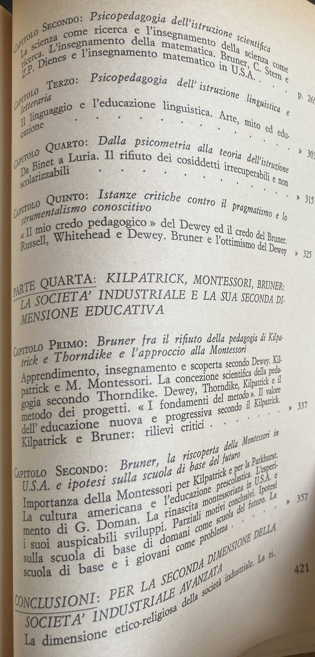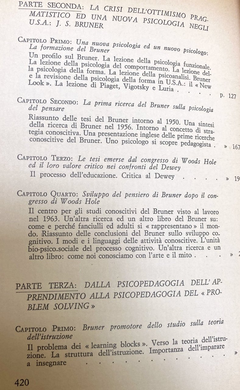Soggetti: Pedagogia Educazione Filosofia Pedagogisti Pensiero Teorie pedagogiche Jerome Seymour Infanzia Crescita Apprendimento Scuola americana Rivoluzione democratica Ottimismo USA Ricerca Stati Uniti Europa Colonialismo Imperialismo Influenza culturale Tecnologia Crisi 1929 Kilpatrick Marxismo Comunitaria Comunitarismo Pragmatismo Critica Umanisti Hutchins Adler Essenzialisti Essenzialismo Critici Riforma scolastica Insegnamento Didattica Metodi Lettura Esperienza Civiltà Dialogo Jean Maritain Problema religioso Formazione Insegnanti Seconda guerra mondiale Istruzione Uguaglianza Competizione Meritocrazia Diritto Autonomia Intelligenza Congresso Woods Hole Lezioni Psicologia funzionale Comportamento Forma Psicoanalisi Revisione New Look Piaget Vigotsky Luria Lurija Leontjev Pensare Tesi Anni Cinquanta Sessanta Settanta Concetto Strategia conoscitiva Inglese Studi conoscitivi Lavoro Fanciulli Adulti Bambini Ragazzi Adolescenza Sviluppo cognitivo Modi Linguaggio Attività Biologia Arte Mito Problem Solving Teoria Learning blocks Struttura Imparare Insegnare Psicopedagogia Scientifica Scienza Matematica Dienes Linguistica Letteratura Letteraria Psicometria Binet Irrecuperabili Non Scolarizzabili Strumentalismo conoscitivo Brun Russell Whitehead Desty Thorndike Montessoriano Maria Montessori Kipnike Fondamenti Progressiva Kilpumik Mantonis Base Park Rinascita Giovani Futuro Dimensione etico-religiosa Società Abbagnano Borghi Adorno Sant'Agostino Allport Brandwein Brecht Aristotele Bridgman Austin Babbit Bartlett Bentley Bergson Burke Burnham Canestrari Cantril Carroll Claparède Edison Einstein Codignola Gentile Goethe Goodnow Benedetto Croce Gottschadt Dahrendorf Dante Darwin Decroly Doman Durkheim Hegel Gekepzard Hilferding Filangieri Festinger Erikson Foerster Lenin Freud Levin Fröbel Galileo Gattegno Ittelson Husserl Hume Humboldt Lutero Huxley Marcuse Marsinovkaya James Jakobson Kafka Hallen Kant Kierkegaard Koffka Köhler Lewin Locke Lombardo Radice Machiavelli Maimonide Mann Masullo Max Weber Melville Mendel Montaigne Mussolini Napoleone Newton Noam Chomsky O'Connor Oppenheimer Pareto Pascal Pavlov Pestalozzi Platone Pirandello Poincaré Postman Rapaport Read Roosevelt Spranger Spock Ugo Spirito Stern Tocqueville Tommaso d'Aquino Tolman Rousseau Veblen Sartre Schelling Schiller Visalberghi Volpicelli Watson Wertheimer Weil Whitman Schwabb Wilson Seguin Shakespeare Skinner Smolensky Wittgenstein Woodworth Wundt Wynne Zazzo Capacità Abilità Disabili Deficit Attenzione Novecento Don Milani Libri universitari fuori catalogo Manuali Collezionismo Bibliografia Riferimento Programmi scolastici Epistemologia Goodman Intenzionalità Intersoggettività Memoria autobiografica Paradigmatico Narrativo Verosimiglianza Racconto Racconti Narrazione Significato Actual Minds Possible Worlds Acts Meaning Curriculum Bentley Glass Conferenza Corso David Page Dispositivi Discipline Don Williams Film Francis Ginevra Geometria Voti Harvard Inhelder Intellettuale Jerrold Zacharias John Blum Laboratorio Lee Cronbach Operazioni logiche Lord Jim Manipolazione Materiali Ralph Gerard Richard Alpert Stile Televisione Tema Comprensione Umanesimo Teoretica Anormali Pedagogy Education Philosophy Pedagogists Thought Pedagogical theories Childhood Growth Learning American school Democratic revolution Optimism Research United States Europe Colonialism Imperialism Cultural influence Technology Crisis Marxism Communitarianism Pragmatism Criticism Humanists Essentialists Essentialism Critics Reform Teaching Didactics Methods Reading Experience Civilization Dialogue Religious Teacher training Second world war Equality Competition Meritocracy Law Autonomy Intelligence Congress Lessons Functional psychology Behavior Psychoanalysis Revision Thesis Fifties Sixties Seventies Concept Cognitive strategy English Cognitive studies Children Adults Kids Teenagers Adolescence development Ways Language Activities Biology Myth Theory Structure Learning Psychopedagogy Scientific Science Mathematics Linguistics Literary literature Psychometry Cognitive instrumentalism Foundations Progressive Rebirth Youth Future Ethical-religious dimension Society Capacity Abilities Disabled Attention Twentieth century University books out of print Manuals Collectibles Bibliography Reference Programs Epistemology Intentionality Memory Narrative Verisimilitude Story Stories Narration Conference Course Devices Disciplines Geometry Grades Intellectual Laboratory Logical operations Manipulation Materials Theme Understanding Humanism Theoretical Abnormal