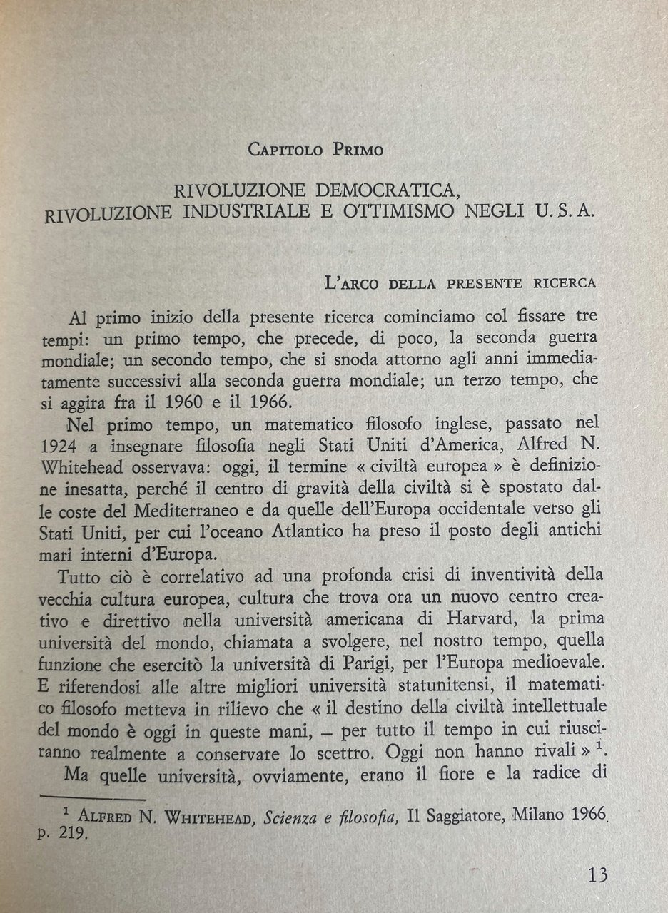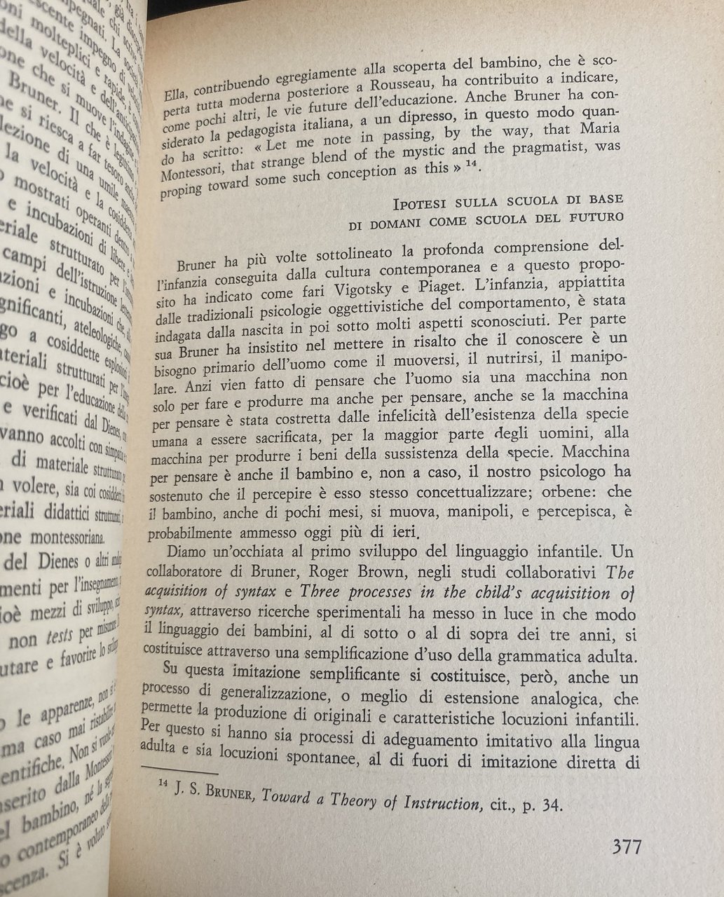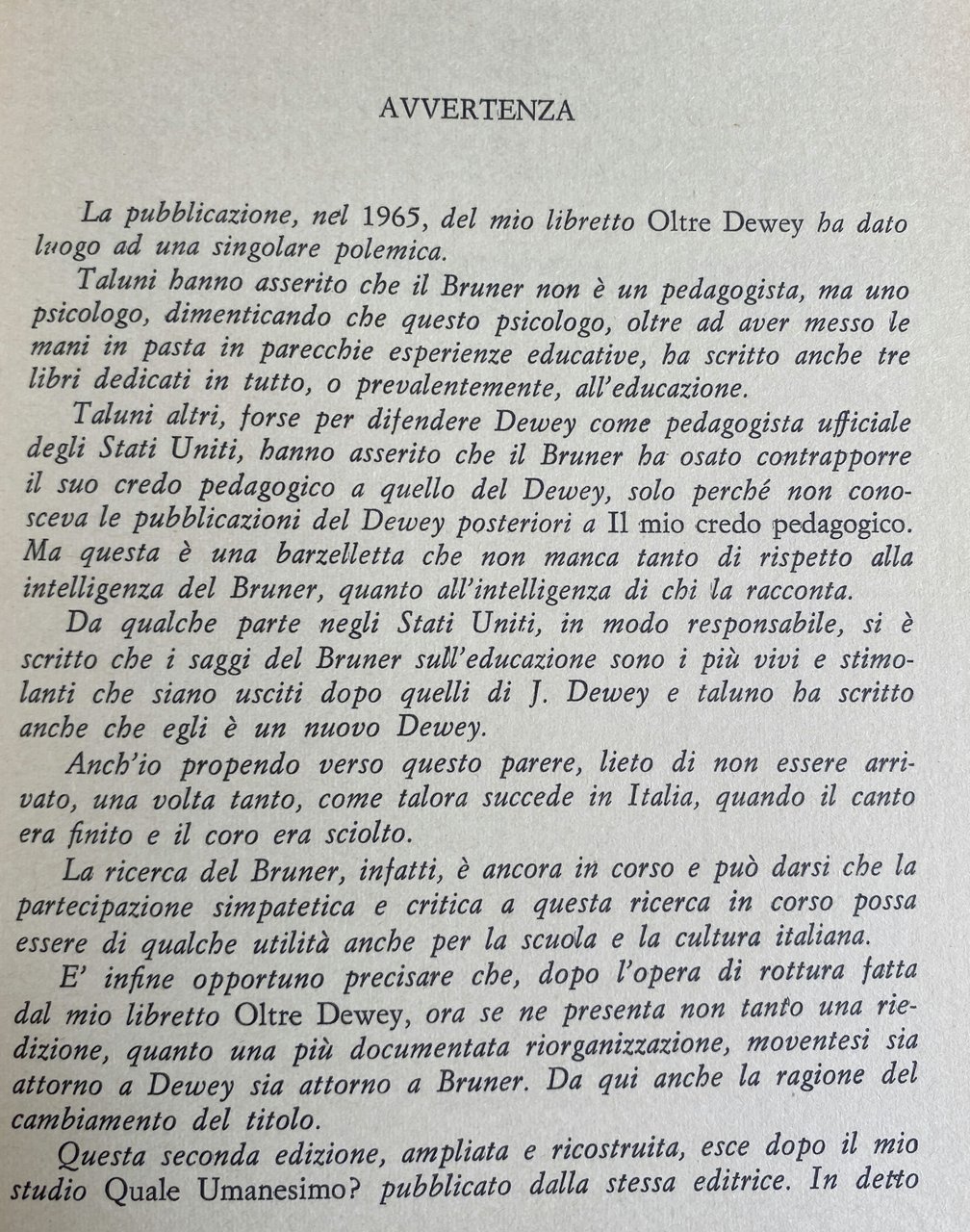 Soggetti: Pedagogia Educazione Filosofia Pedagogisti Pensiero Teorie pedagogiche Jerome Seymour Infanzia Crescita Apprendimento Scuola americana Rivoluzione democratica Ottimismo USA Ricerca Stati Uniti Europa Colonialismo Imperialismo Influenza culturale Tecnologia Crisi 1929 Kilpatrick Marxismo Comunitaria Comunitarismo Pragmatismo Critica Umanisti Hutchins Adler Essenzialisti Essenzialismo Critici Riforma scolastica Insegnamento Didattica Metodi Lettura Esperienza Civiltà Dialogo Jean Maritain Problema religioso Formazione Insegnanti Seconda guerra mondiale Istruzione Uguaglianza Competizione Meritocrazia Diritto Autonomia Intelligenza Congresso Woods Hole Lezioni Psicologia funzionale Comportamento Forma Psicoanalisi Revisione New Look Piaget Vigotsky Luria Lurija Leontjev Pensare Tesi Anni Cinquanta Sessanta Settanta Concetto Strategia conoscitiva Inglese Studi conoscitivi Lavoro Fanciulli Adulti Bambini Ragazzi Adolescenza Sviluppo cognitivo Modi Linguaggio Attività Biologia Arte Mito Problem Solving Teoria Learning blocks Struttura Imparare Insegnare Psicopedagogia Scientifica Scienza Matematica Dienes Linguistica Letteratura Letteraria Psicometria Binet Irrecuperabili Non Scolarizzabili Strumentalismo conoscitivo Brun Russell Whitehead Desty Thorndike Montessoriano Maria Montessori Kipnike Fondamenti Progressiva Kilpumik Mantonis Base Park Rinascita Giovani Futuro Dimensione etico-religiosa Società Abbagnano Borghi Adorno Sant'Agostino Allport Brandwein Brecht Aristotele Bridgman Austin Babbit Bartlett Bentley Bergson Burke Burnham Canestrari Cantril Carroll Claparède Edison Einstein Codignola Gentile Goethe Goodnow Benedetto Croce Gottschadt Dahrendorf Dante Darwin Decroly Doman Durkheim Hegel Gekepzard Hilferding Filangieri Festinger Erikson Foerster Lenin Freud Levin Fröbel Galileo Gattegno Ittelson Husserl Hume Humboldt Lutero Huxley Marcuse Marsinovkaya James Jakobson Kafka Hallen Kant Kierkegaard Koffka Köhler Lewin Locke Lombardo Radice Machiavelli Maimonide Mann Masullo Max Weber Melville Mendel Montaigne Mussolini Napoleone Newton Noam Chomsky O'Connor Oppenheimer Pareto Pascal Pavlov Pestalozzi Platone Pirandello Poincaré Postman Rapaport Read Roosevelt Spranger Spock Ugo Spirito Stern Tocqueville Tommaso d'Aquino Tolman Rousseau Veblen Sartre Schelling Schiller Visalberghi Volpicelli Watson Wertheimer Weil Whitman Schwabb Wilson Seguin Shakespeare Skinner Smolensky Wittgenstein Woodworth Wundt Wynne Zazzo Capacità Abilità Disabili Deficit Attenzione Novecento Don Milani Libri universitari fuori catalogo Manuali Collezionismo Bibliografia Riferimento Programmi scolastici Epistemologia Goodman Intenzionalità Intersoggettività Memoria autobiografica Paradigmatico Narrativo Verosimiglianza Racconto Racconti Narrazione Significato Actual Minds Possible Worlds Acts Meaning Curriculum Bentley Glass Conferenza Corso David Page Dispositivi Discipline Don Williams Film Francis Ginevra Geometria Voti Harvard Inhelder Intellettuale Jerrold Zacharias John Blum Laboratorio Lee Cronbach Operazioni logiche Lord Jim Manipolazione Materiali Ralph Gerard Richard Alpert Stile Televisione Tema Comprensione Umanesimo Teoretica Anormali Pedagogy Education Philosophy Pedagogists Thought Pedagogical theories Childhood Growth Learning American school Democratic revolution Optimism Research United States Europe Colonialism Imperialism Cultural influence Technology Crisis Marxism Communitarianism Pragmatism Criticism Humanists Essentialists Essentialism Critics Reform Teaching Didactics Methods Reading Experience Civilization Dialogue Religious Teacher training Second world war Equality Competition Meritocracy Law Autonomy Intelligence Congress Lessons Functional psychology Behavior Psychoanalysis Revision Thesis Fifties Sixties Seventies Concept Cognitive strategy English Cognitive studies Children Adults Kids Teenagers Adolescence development Ways Language Activities Biology Myth Theory Structure Learning Psychopedagogy Scientific Science Mathematics Linguistics Literary literature Psychometry Cognitive instrumentalism Foundations Progressive Rebirth Youth Future Ethical-religious dimension Society Capacity Abilities Disabled Attention Twentieth century University books out of print Manuals Collectibles Bibliography Reference Programs Epistemology Intentionality Memory Narrative Verisimilitude Story Stories Narration Conference Course Devices Disciplines Geometry Grades Intellectual Laboratory Logical operations Manipulation Materials Theme Understanding Humanism Theoretical Abnormal
